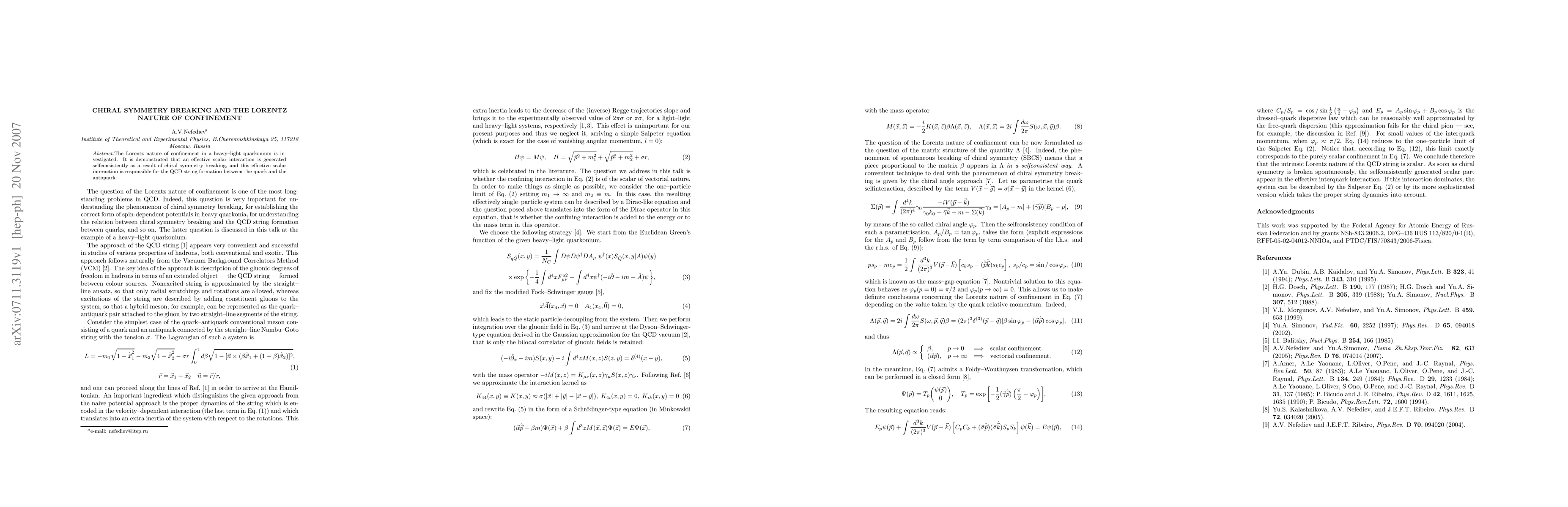 Summary: The research explores the Lorentz nature of confinement in heavy-light quarkonium systems, revealing that chiral symmetry breaking generates an effective scalar interaction, which leads to QCD string formation between quarks and antiquarks.