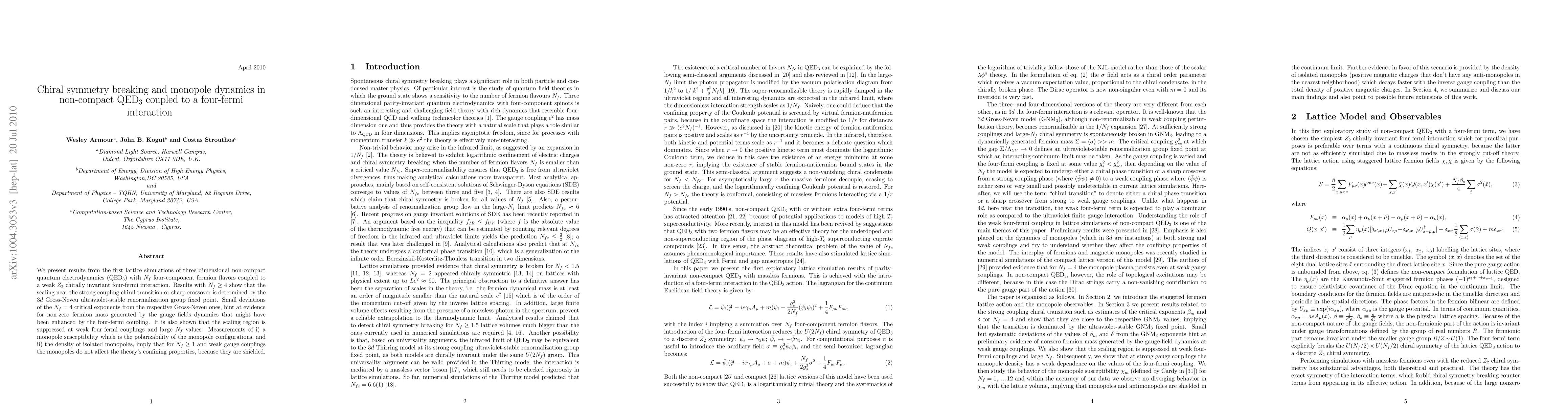 We present results from the first lattice simulations of three dimensional non-compact quantum electrodynamics (QED3) with N_f four-component fermion flavors coupled to a weak Z(2) chirally invariant four-fermi interaction. Results with $N_f \ge 4$ show that the scaling near the strong coupling chiral transition or sharp crossover is determined by the 3d Gross Neveu ultraviolet-stable renormalization group fixed point. Small deviations of the N_f=4 critical exponents from the respective Gross Neveu ones, hint at evidence for non-zero fermion mass generated by the gauge fields dynamics that might have been enhanced by the four-fermi coupling. It is also shown that the scaling region is suppressed at weak four-fermi couplings and large N_f values. Measurements of i) a monopole susceptibility which is the polarizability of the monopole configurations, and ii) the density of isolated monopoles, imply that for $N_f \ge 1$ and weak gauge couplings the monopoles do not affect the theory's confining properties, because they are shielded.