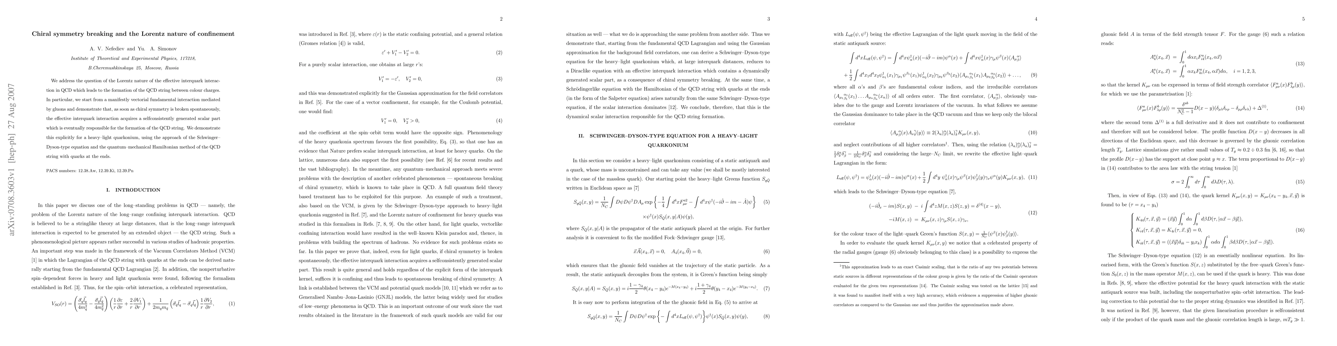 This paper investigates the Lorentz nature of the effective interquark interaction in QCD, showing that spontaneous chiral symmetry breaking generates a scalar part responsible for the QCD string formation. The study uses a heavy-light quarkonium system and employs Schwinger-Dyson-type equations and the quantum-mechanical Hamiltonian method to demonstrate this.