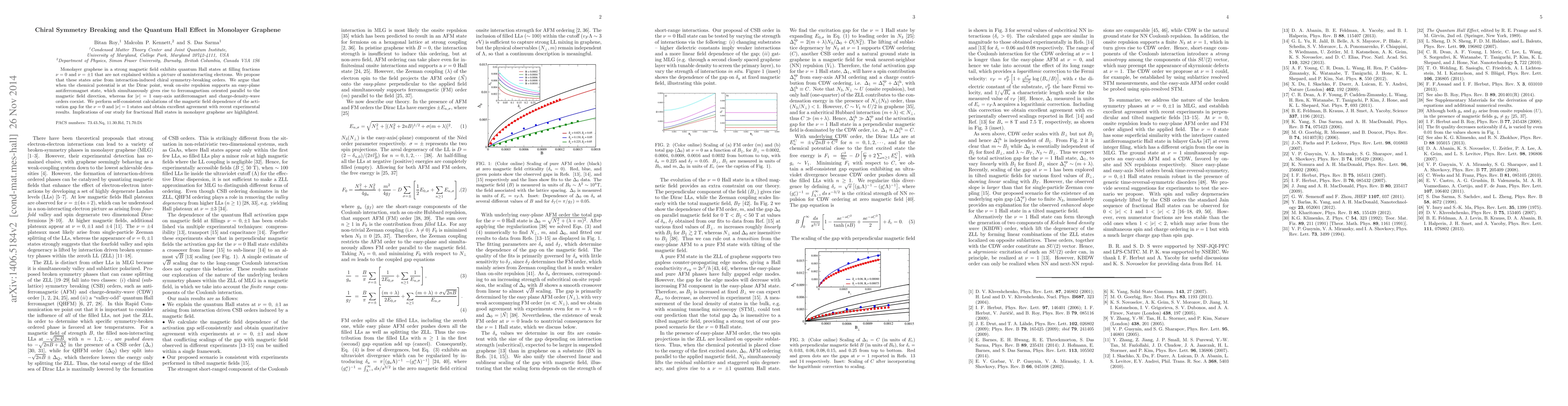 Summary: Monolayer graphene under strong magnetic fields shows quantum Hall states at $\nu = 0$ and $\nu = \pm 1$ explained by interaction-induced chiral symmetry breaking. Proposed orders include easy-plane antiferromagnetism and parallel ferromagnetism at the Dirac point, and easy-axis antiferromagnetism and charge-density waves at $|\nu|=1$, supported by self-consistent calculations matching experimental results.