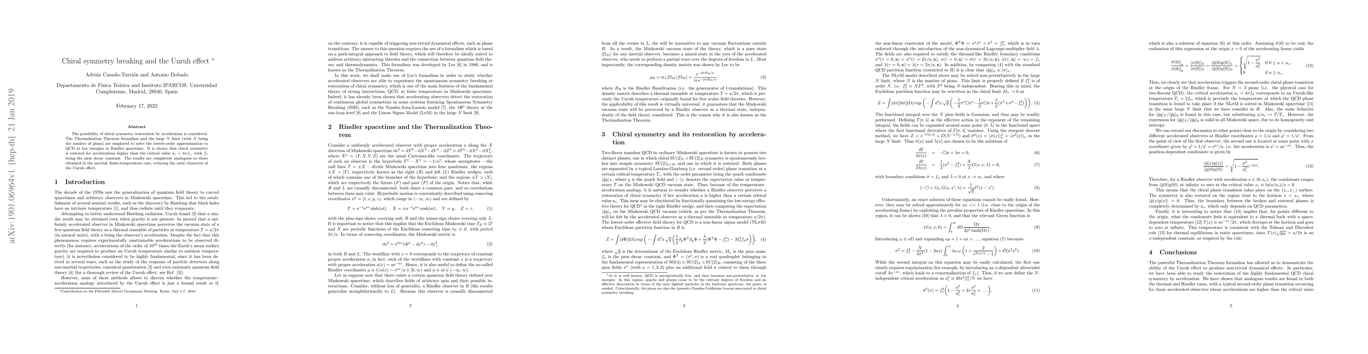 The possibility of chiral symmetry restoration by acceleration is considered. The Thermalization Theorem formalism and the large $N$ limit (with $N$ being the number of pions) are employed to solve the lowest-order approximation to QCD at low energies in Rindler spacetime. It is shown that chiral symmetry is restored for accelerations higher than the critical value $a_c=4\pi f_\pi$, with $f_\pi$ being the pion decay constant. The results are completely analogous to those obtained in the inertial, finite-temperature case, evincing the ontic character of the Unruh effect.