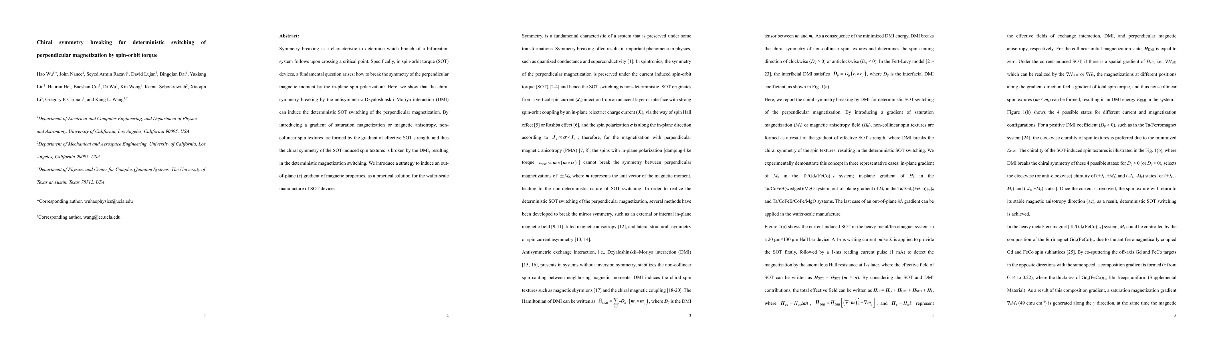 This paper investigates chiral symmetry breaking in spin-orbit torque (SOT) devices, showing that the Dzyaloshinskii-Moriya interaction (DMI) can deterministically switch perpendicular magnetization by breaking symmetry through non-collinear spin textures, facilitated by a gradient in magnetic properties. A practical approach to induce a z-gradient of magnetic properties is proposed for large-scale SOT device manufacturing.