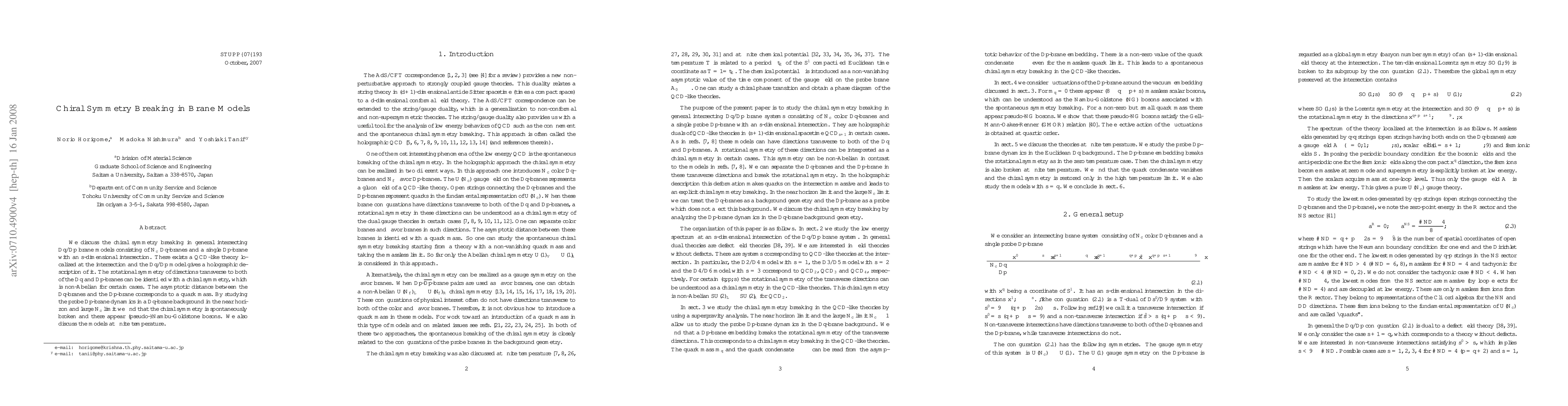 This paper explores chiral symmetry breaking in intersecting Dq/Dp brane models, demonstrating spontaneous symmetry breaking and the emergence of pseudo-Nambu-Goldstone bosons through the dynamics of a probe Dp-brane in a Dq-brane background, with implications for finite temperature scenarios.