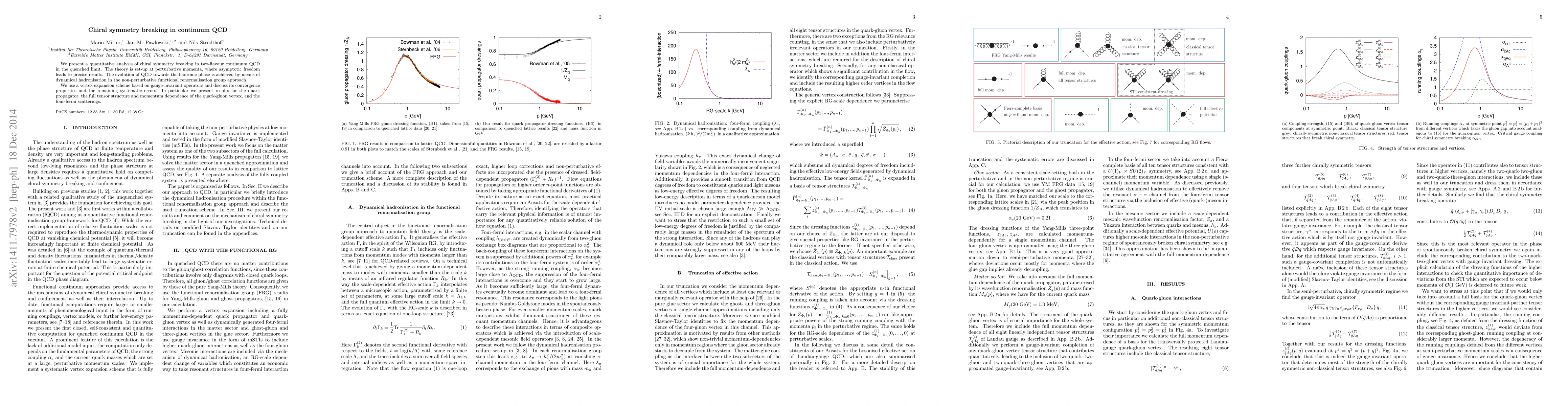 We present a quantitative analysis of chiral symmetry breaking in two-flavour continuum QCD in the quenched limit. The theory is set-up at perturbative momenta, where asymptotic freedom leads to precise results. The evolution of QCD towards the hadronic phase is achieved by means of dynamical hadronisation in the non-perturbative functional renormalisation group approach. We use a vertex expansion scheme based on gauge-invariant operators and discuss its convergence properties and the remaining systematic errors. In particular we present results for the quark propagator, the full tensor structure and momentum dependence of the quark-gluon vertex, and the four-fermi scatterings.