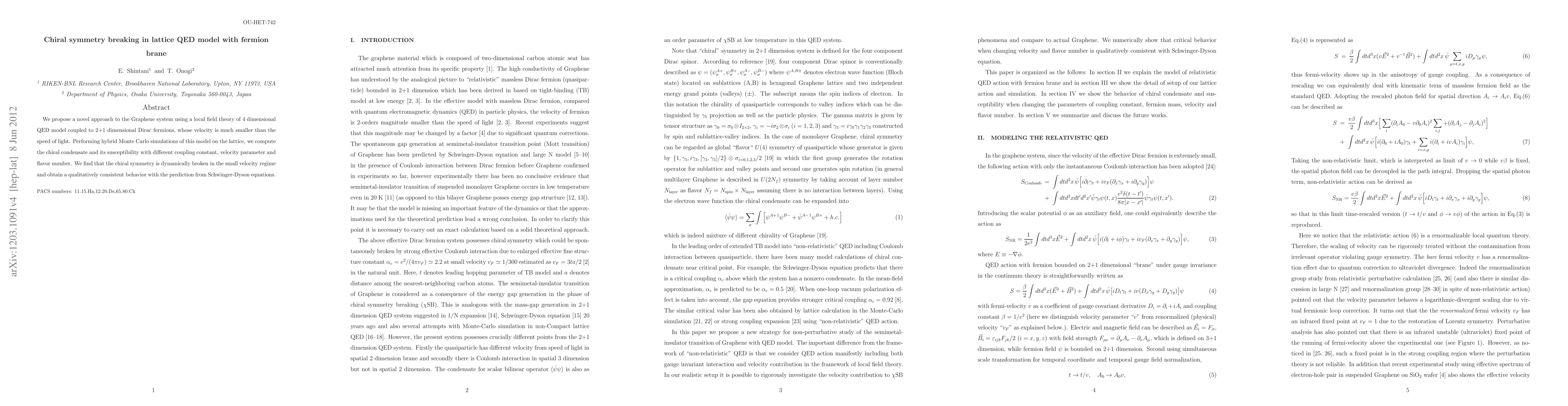 We propose a novel approach to the Graphene system using a local field theory of 4 dimensional QED model coupled to 2+1 dimensional Dirac fermions, whose velocity is much smaller than the speed of light. Performing hybrid Monte Carlo simulations of this model on the lattice, we compute the chiral condensate and its susceptibility with different coupling constant, velocity parameter and flavor number. We find that the chiral symmetry is dynamically broken in the small velocity regime and obtain a qualitatively consistent behavior with the prediction from Schwinger-Dyson equations.