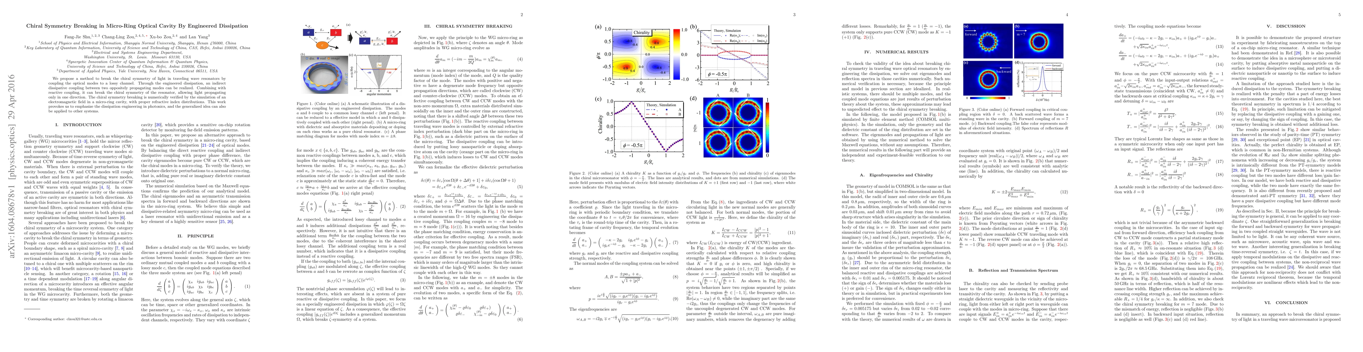 This paper proposes a method for breaking chiral symmetry in micro-ring optical cavities using engineered dissipation, achieving indirect coupling between oppositely propagating modes. Numerical simulations confirm the chiral symmetry breaking, highlighting the potential of dissipation engineering in photonics.