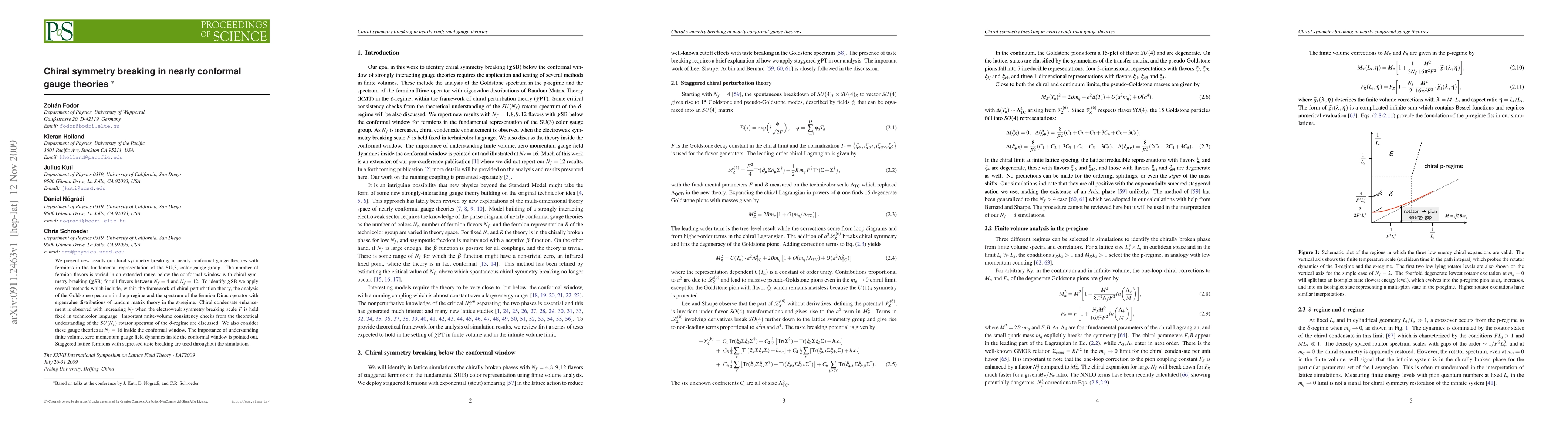 We present new results on chiral symmetry breaking in nearly conformal gauge theories with fermions in the fundamental representation of the SU(3) color gauge group. The number of fermion flavors is varied in an extended range below the conformal window with chiral symmetry breaking ($\chi{\rm SB}$) for all flavors between $N_f=4$ and $N_f=12$. To identify $\chi{\rm SB}$ we apply several methods which include, within the framework of chiral perturbation theory, the analysis of the Goldstone spectrum in the p-regime and the spectrum of the fermion Dirac operator with eigenvalue distributions of random matrix theory in the $\eps$-regime. Chiral condensate enhancement is observed with increasing $N_f$ when the electroweak symmetry breaking scale $F$ is held fixed in technicolor language. Important finite-volume consistency checks from the theoretical understanding of the $SU(N_f)$ rotator spectrum of the $\delta$-regime are discussed. We also consider these gauge theories at $N_f=16$ inside the conformal window. The importance of understanding finite volume, zero momentum gauge field dynamics inside the conformal window is pointed out. Staggered lattice fermions with supressed taste breaking are used throughout the simulations.