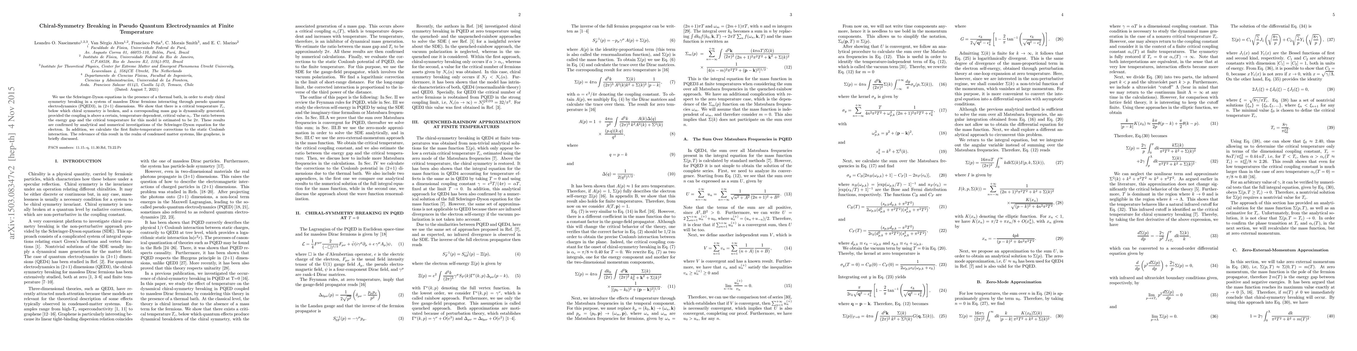 We use the Schwinger-Dyson equations in the presence of a thermal bath, in order to study chiral symmetry breaking in a system of massless Dirac fermions interacting through pseudo quantum electrodynamics (PQED3), in (2+1) dimensions. We show that there is a critical temperature $T_c$, below which chiral symmetry is broken, and a corresponding mass gap is dynamically generated, provided the coupling is above a certain, temperature dependent, critical value $\alpha_c$. The ratio between the energy gap and the critical temperature for this model is estimated to be $2 \pi$. These results are confirmed by analytical and numerical investigations of the Schwinger-Dyson equation for the electron. In addition, we calculate the first finite-temperature corrections to the static Coulomb interaction. The relevance of this result in the realm of condensed matter systems, like graphene, is briefly discussed.