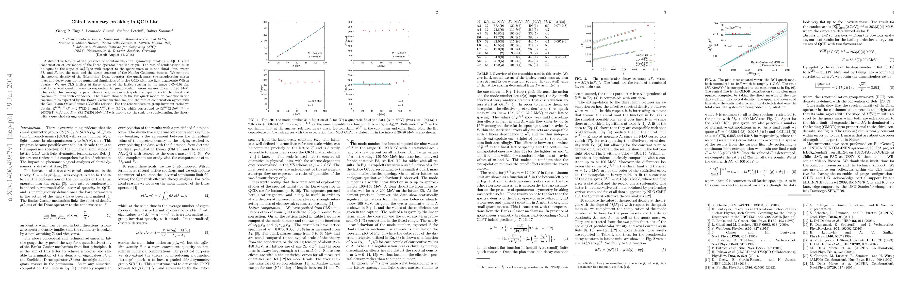 A distinctive feature of the presence of spontaneous chiral symmetry breaking in QCD is the condensation of low modes of the Dirac operator near the origin. The rate of condensation must be equal to the slope of (Mpi^2 Fpi^2)/2 with respect to the quark mass m in the chiral limit, where Mpi and Fpi are the mass and the decay constant of the Nambu-Goldstone bosons. We compute the spectral density of the (Hermitian) Dirac operator, the quark mass, the pseudoscalar meson mass and decay constant by numerical simulations of lattice QCD with two light degenerate Wilson quarks. We use CLS lattices at three values of the lattice spacing in the range 0.05-0.08 fm, and for several quark masses corresponding to pseudoscalar mesons masses down to 190 MeV. Thanks to this coverage of parameters space, we can extrapolate all quantities to the chiral and continuum limits with confidence. The results show that the low quark modes do condense in the continuum as expected by the Banks-Casher mechanism, and the rate of condensation agrees with the Gell-Mann-Oakes-Renner (GMOR) relation. For the renormalisation-group-invariant ratios we obtain [\Sigma^RGI]^(1/3)/F =2.77(2)(4) and Lambda^MSbar/F = 3.6(2), which correspond to [\Sigma^\MSbar(2 GeV)]^(1/3) =263(3)(4) MeV and F=85.8(7)(20) MeV if FK is used to set the scale by supplementing the theory with a quenched strange quark.