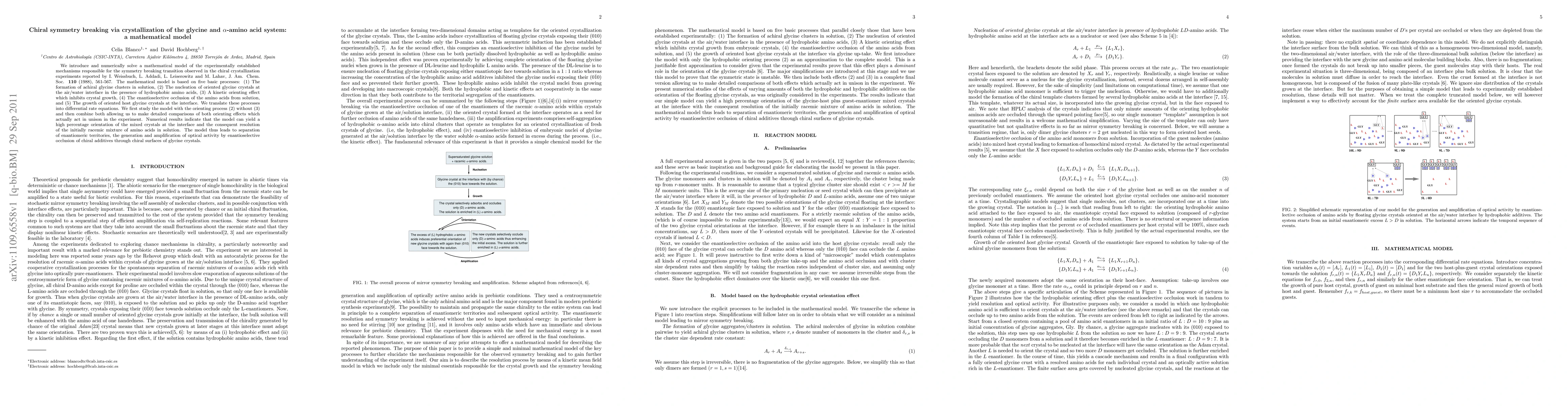 We introduce and numerically solve a mathematical model of the experimentally established mechanisms responsible for the symmetry breaking transition observed in the chiral crystallization experiments reported by I. Weissbuch, L. Addadi, L. Leiserowitz and M. Lahav, J. Am. Chem. Soc. 110 (1988), 561-567. The mathematical model is based on five basic processes: (1) The formation of achiral glycine clusters in solution, (2) The nucleation of oriented glycine crystals at the air/water interface in the presence of hydrophobic amino acids, (3) A kinetic orienting effect which inhibits crystal growth, (4) The enantioselective occlusion of the amino acids from solution, and (5) The growth of oriented host glycine crystals at the interface. We translate these processes into differential rate equations. We first study the model with the orienting process (2) without (3) and then combine both allowing us to make detailed comparisons of both orienting effects which actually act in unison in the experiment. Numerical results indicate that the model can yield a high percentage orientation of the mixed crystals at the interface and the consequent resolution of the initially racemic mixture of amino acids in solution. The model thus leads to separation of enantiomeric territories, the generation and amplification of optical activity by enantioselective occlusion of chiral additives through chiral surfaces of glycine crystals.