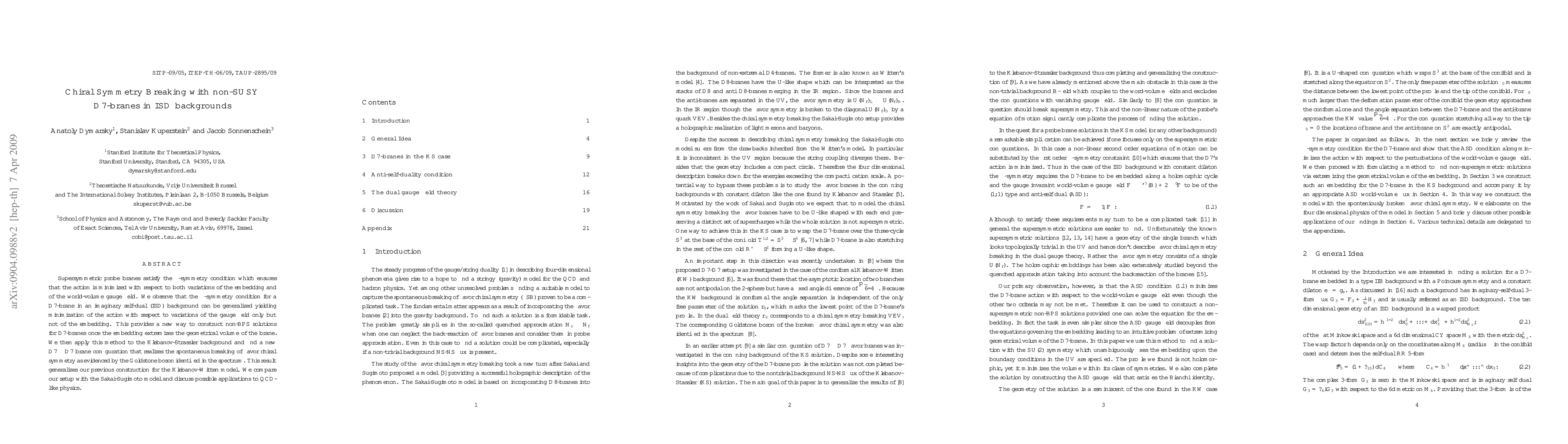 Supersymmetric probe branes satisfy the kappa-symmetry condition which ensures that the action is minimized with respect to both variations of the embedding and of the world-volume gauge field. We observe that the kappa-symmetry condition for a D7-brane in an imaginary self-dual (ISD) background can be generalized yielding minimization of the action with respect to variations of the gauge field only but not of the embedding. This provides a new way to construct non-BPS solutions for D7-branes once the embedding extremizes the geometrical volume of the brane. We then apply this method to the Klebanov-Strassler background and find a new D7-anti D7-brane configuration that realizes the spontaneous breaking of flavor chiral symmetry as evidenced by the Goldstone boson identified in the spectrum. This result generalizes our previous construction for the Klebanov-Witten model. We compare our setup with the Sakai-Sugimoto model and discuss possible applications to QCD-like physics.