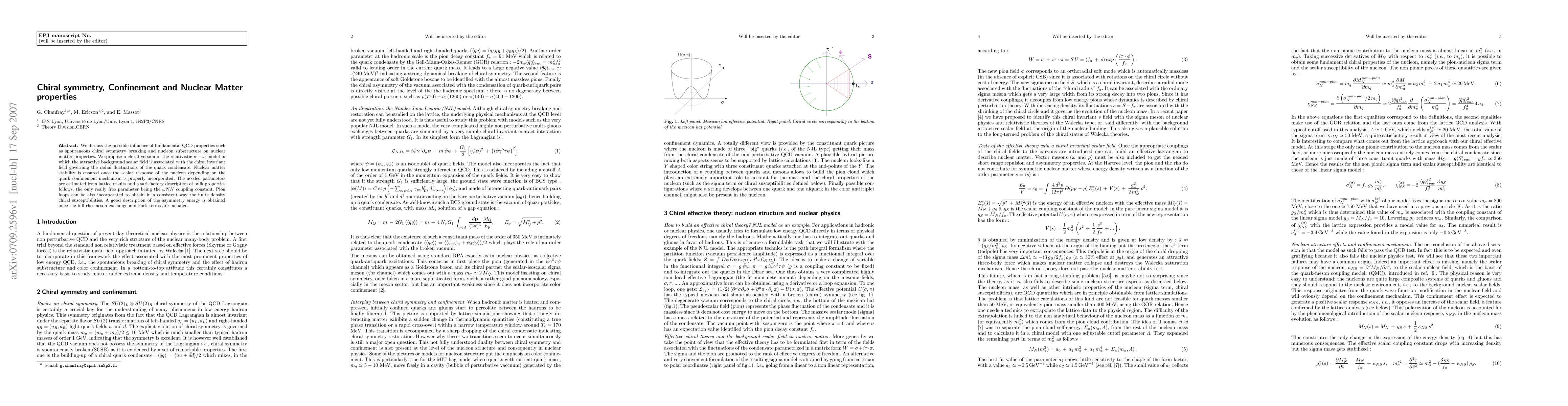 We discuss the possible influence of fundamental QCD properties such as spontaneous chiral symmetry breaking and nucleon substructure on nuclear matter properties. We propose a chiral version of the relativistic $\sigma-\omega$ model in which the attractive background scalar field is associated with the chiral invariant field governing the radial fluctuations of the quark condensate. Nuclear matter stability is ensured once the scalar response of the nucleon depending on the quark confinement mechanism is properly incorporated. The needed parameters are estimated from lattice results and a satisfactory description of bulk properties follows, the only really free parameter being the $\omega NN$ coupling constant. Pion loops can be also incorporated to obtain in a consistent way the finite density chiral susceptibilities. A good description of the asymmetry energy is obtained once the full rho meson exchange and Fock terms are included.