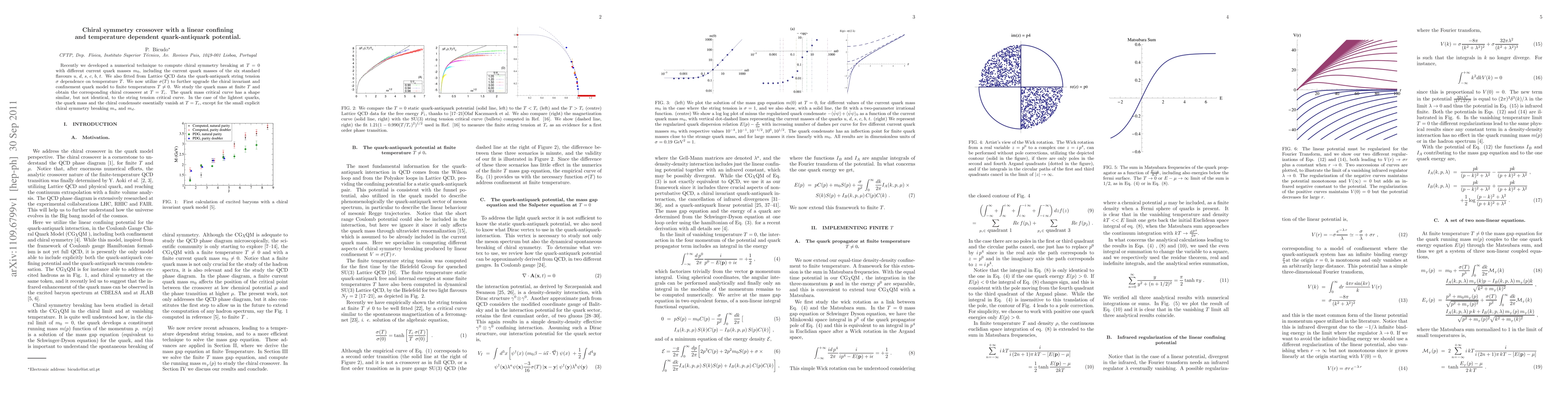 This paper develops a numerical method to study chiral symmetry breaking and the quark-antiquark potential at finite temperatures, revealing a chiral crossover at critical temperature Tc. The model incorporates temperature-dependent string tension from Lattice QCD data, showing quark mass critical behavior similar but distinct from the string tension critical curve.