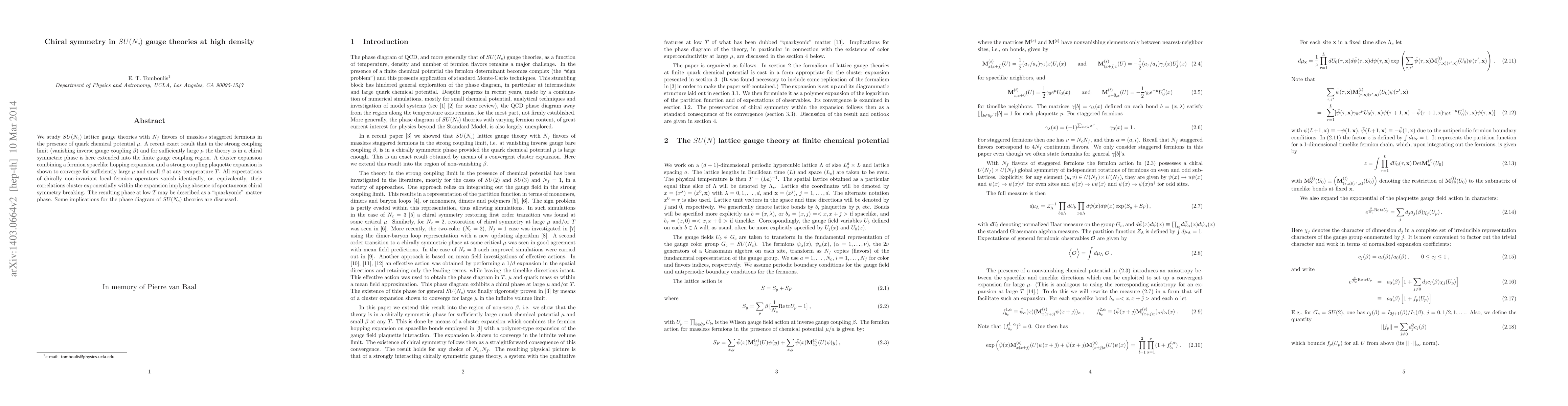 We study $SU(N_c)$ lattice gauge theories with $N_f$ flavors of massless staggered fermions in the presence of quark chemical potential $\mu$. A recent exact result that in the strong coupling limit (vanishing inverse gauge coupling $\beta$) and for sufficiently large $\mu$ the theory is in a chiral symmetric phase is here extended into the finite gauge coupling region. A cluster expansion combining a fermion spacelike hopping expansion and a strong coupling plaquette expansion is shown to converge for sufficiently large $\mu$ and small $\beta$ at any temperature $T$. All expectations of chirally non-invariant local fermion operators vanish identically, or, equivalently, their correlations cluster exponentially within the expansion implying absence of spontaneous chiral symmetry breaking. The resulting phase at low $T$ may be described as a "quarkyonic" matter phase. Some implications for the phase diagram of $SU(N_c)$ theories are discussed.