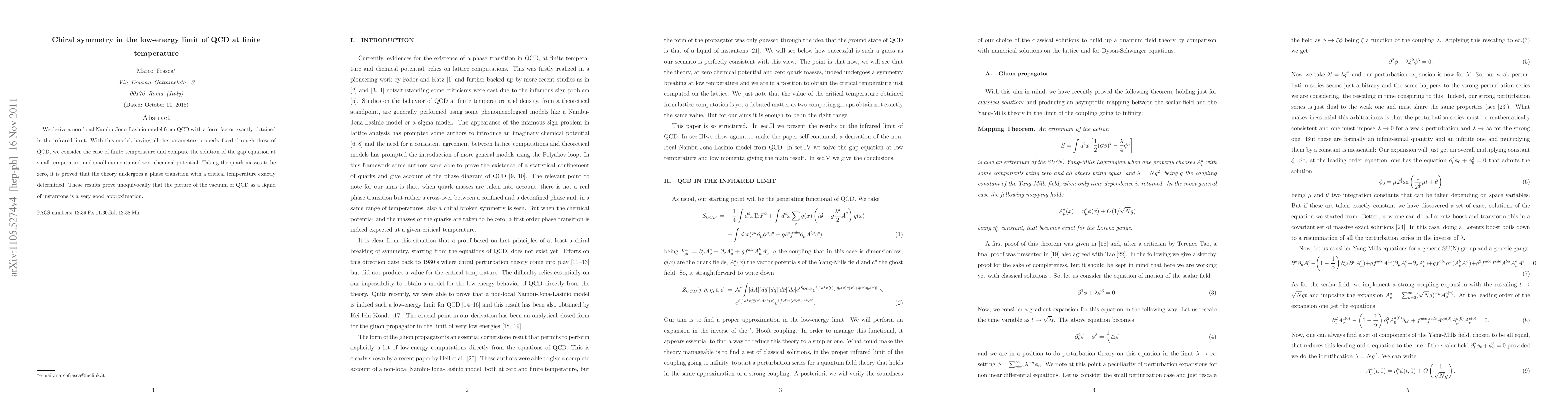 We derive a non-local Nambu-Jona-Lasinio model from QCD with a form factor exactly obtained in the infrared limit. With this model, having all the parameters properly fixed through those of QCD, we consider the case of finite temperature and compute the solution of the gap equation at small temperature and small momenta and zero chemical potential. Taking the quark masses to be zero, it is proved that the theory undergoes a phase transition with a critical temperature exactly determined. These results prove unequivocally that the picture of the vacuum of QCD as a liquid of instantons is a very good approximation.