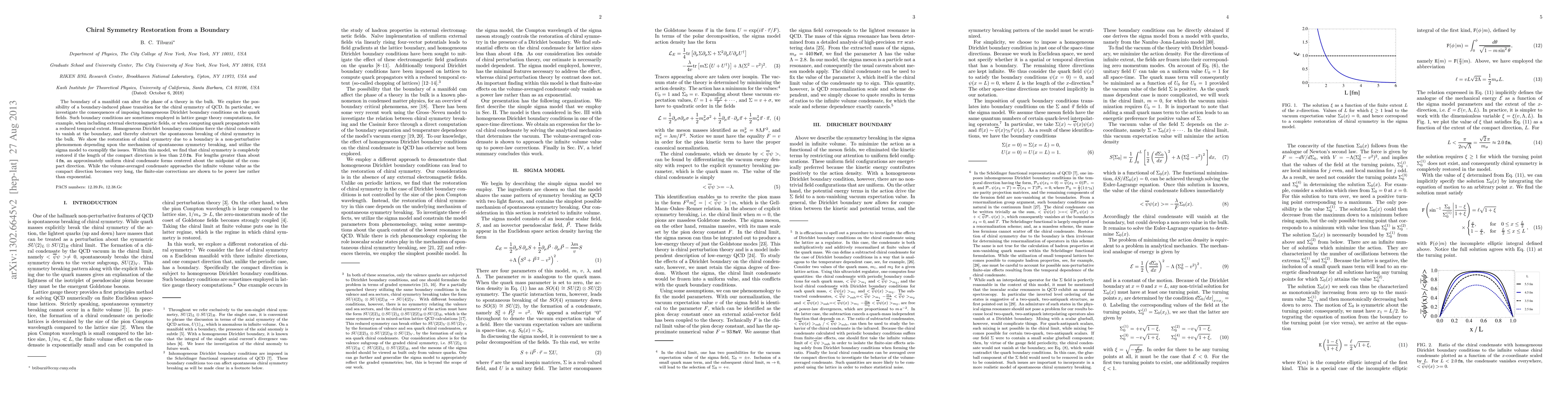 The boundary of a manifold can alter the phase of a theory in the bulk. We explore the possibility of a boundary-induced phase transition for the chiral symmetry of QCD. In particular, we investigate the consequences of imposing homogeneous Dirichlet boundary conditions on the quark fields. Such boundary conditions are sometimes employed in lattice gauge theory computations, for example, when including external electromagnetic fields, or when computing quark propagators with a reduced temporal extent. Homogeneous Dirichlet boundary conditions force the chiral condensate to vanish at the boundary, and thereby obstruct the spontaneous breaking of chiral symmetry in the bulk. We show the restoration of chiral symmetry due to a boundary is a non-perturbative phenomenon depending upon the mechanism of spontaneous symmetry breaking, and utilize the sigma model to exemplify the issues. Within this model, we find that chiral symmetry is completely restored if the length of the compact direction is less than 2.0 fm. For lengths greater than about 4 fm, an approximately uniform chiral condensate forms centered about the midpoint of the compact direction. While the volume-averaged condensate approaches the infinite volume value as the compact direction becomes very long, the finite-size corrections are shown to be power law rather than exponential.