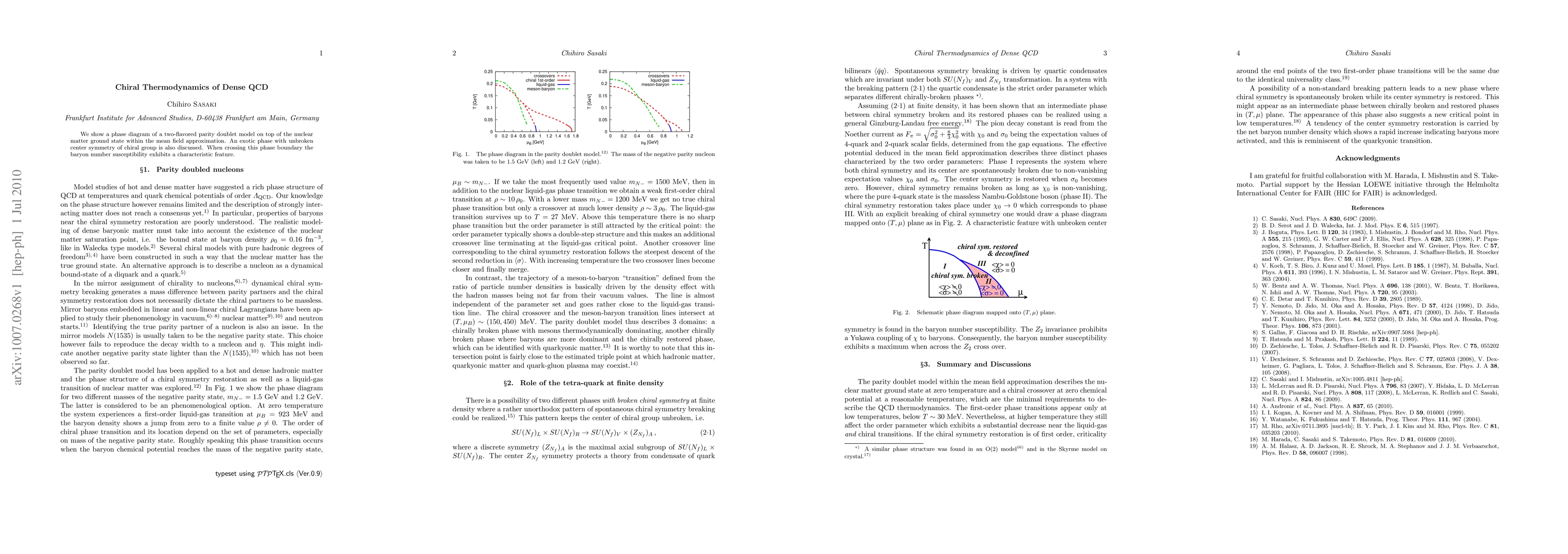 We show a phase diagram of a two-flavored parity doublet model on top of the nuclear matter ground state within the mean field approximation. An exotic phase with unbroken center symmetry of chiral group is also discussed. When crossing this phase boundary the baryon number susceptibility exhibits a characteristic feature.