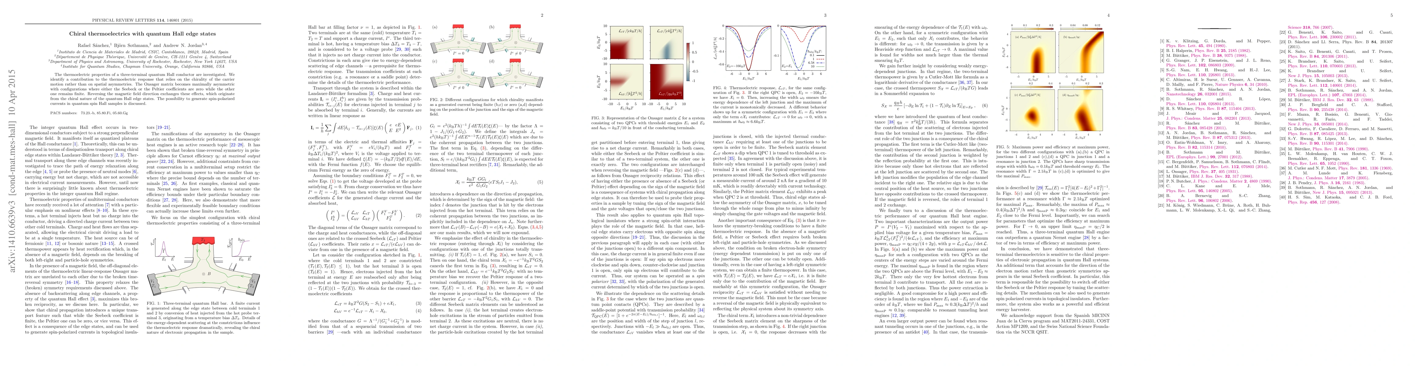 This paper investigates the thermoelectric properties of quantum Hall conductors, revealing a chiral contribution to the response independent of spatial asymmetries. The Onsager matrix exhibits maximal asymmetry, with zero Seebeck or Peltier coefficients, highlighting the chiral nature of quantum Hall edge states and the potential for generating spin-polarized currents.