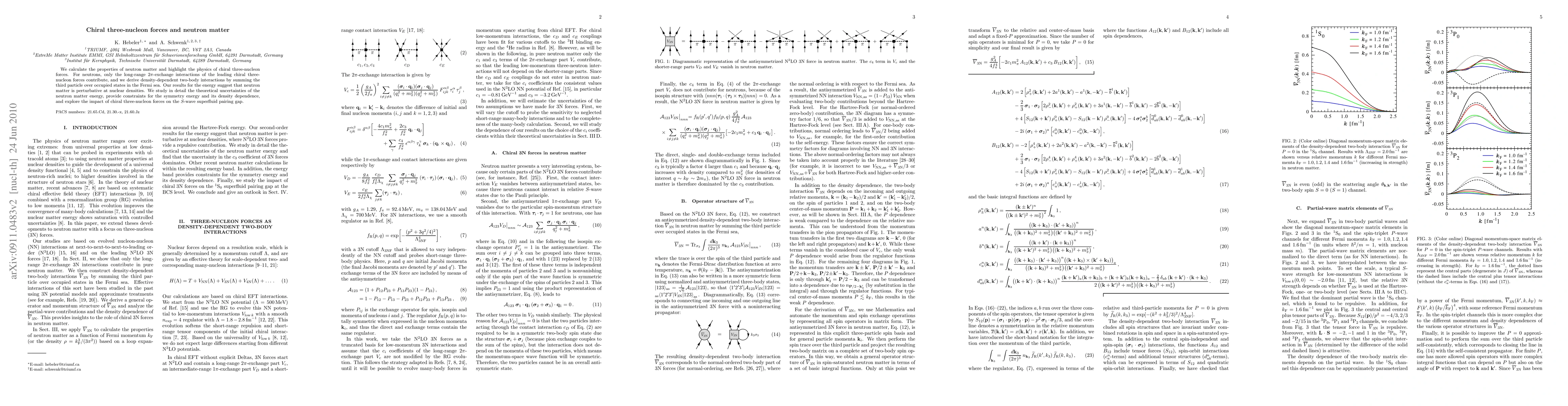 This paper investigates neutron matter properties, focusing on the effects of chiral three-nucleon forces, particularly the long-range 2 pi-exchange interactions. The study derives density-dependent two-body interactions and finds neutron matter to be perturbative at nuclear densities, providing constraints for the symmetry energy and exploring the impact on the S-wave superfluid pairing gap.