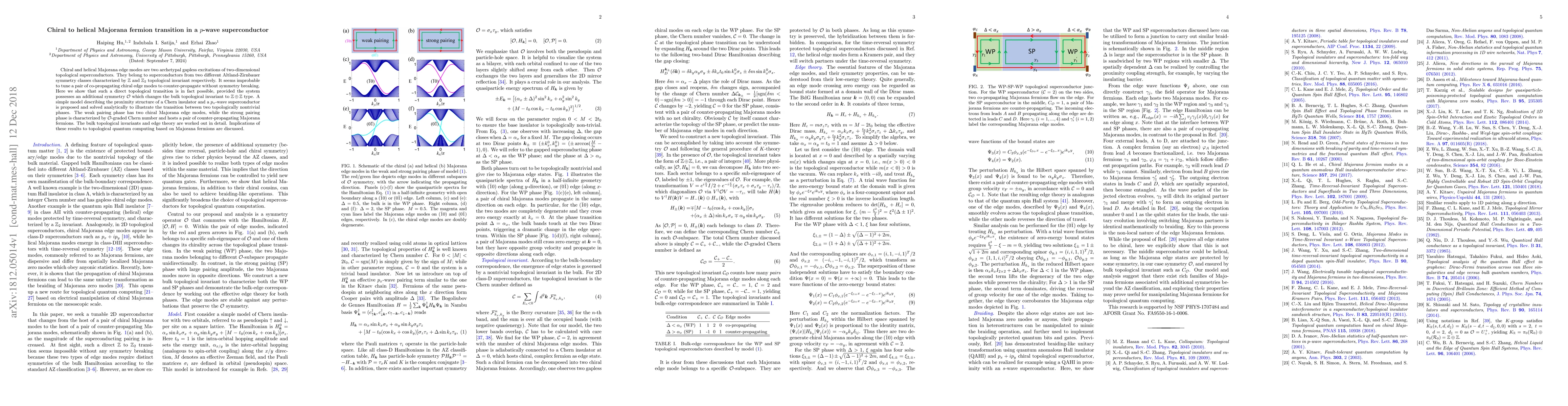 This paper demonstrates a topological transition from chiral Majorana edge modes to helical Majorana fermions in a $p$-wave superconductor, facilitated by an additional symmetry $\mathcal{O}$. The analytical model of a Chern insulator coupled with a $p_x$-wave superconductor illustrates the transition between topological phases, with implications for topological quantum computing.