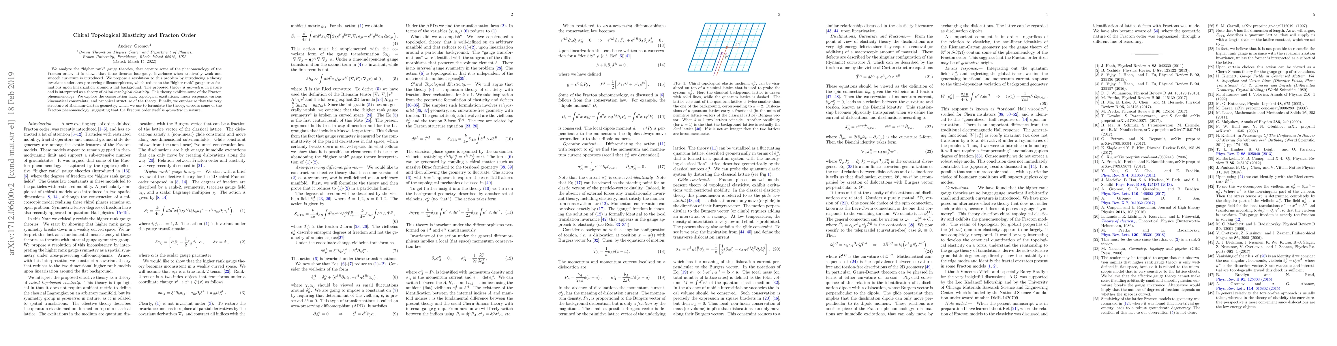 This paper introduces a geometric theory of chiral topological elasticity to resolve issues with gauge invariance in "higher rank" gauge theories related to Fracton order. The proposed theory, invariant under area-preserving diffeomorphisms, exhibits Fracton phenomenology and explores its conservation laws, topological excitations, and kinematical constraints.