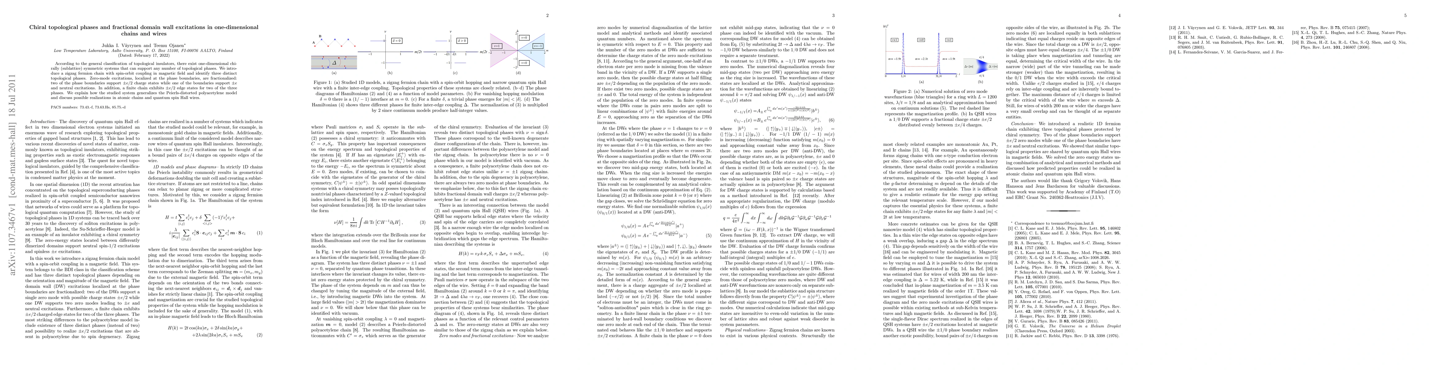 This paper explores chiral topological phases in one-dimensional zigzag fermion chains with spin-orbit coupling, identifying three distinct topological phases with fractional domain wall excitations and edge states. The study generalizes the Peierls-distorted polyacetylene model and suggests potential applications in atomic chains and quantum spin Hall wires.