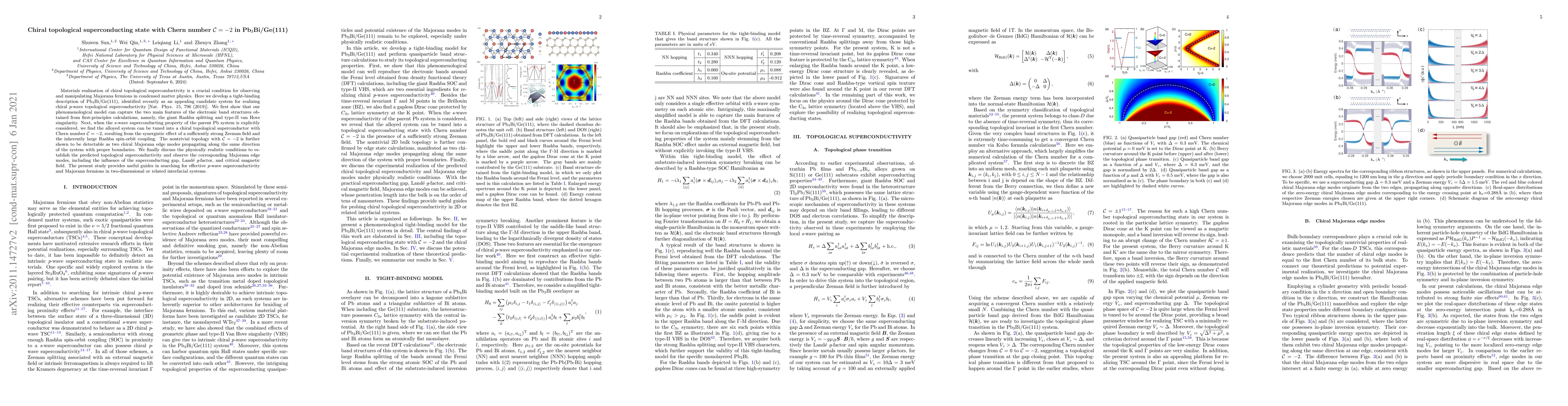 This paper develops a tight-binding model for Pb$_3$Bi/Ge(111) to demonstrate its potential as a chiral topological superconductor with Chern number $\mathcal{C} = -2$. The model captures key electronic features and predicts the emergence of two chiral Majorana edge modes, offering practical guidelines for detecting $p$-wave superconductivity and Majorana fermions in two-dimensional systems.