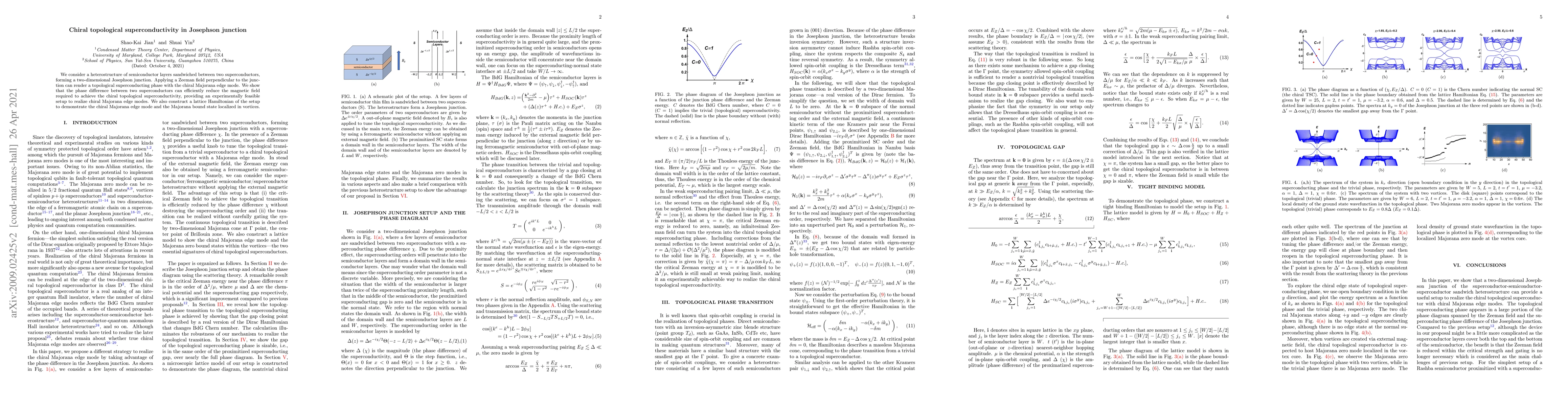 This research explores a semiconductor-superconductor heterostructure in a Josephson junction, demonstrating chiral topological superconductivity enabled by a perpendicular Zeeman field and reduced magnetic field via phase difference between superconductors. The study constructs a lattice Hamiltonian to show chiral Majorana edge modes and Majorana bound states in vortices.