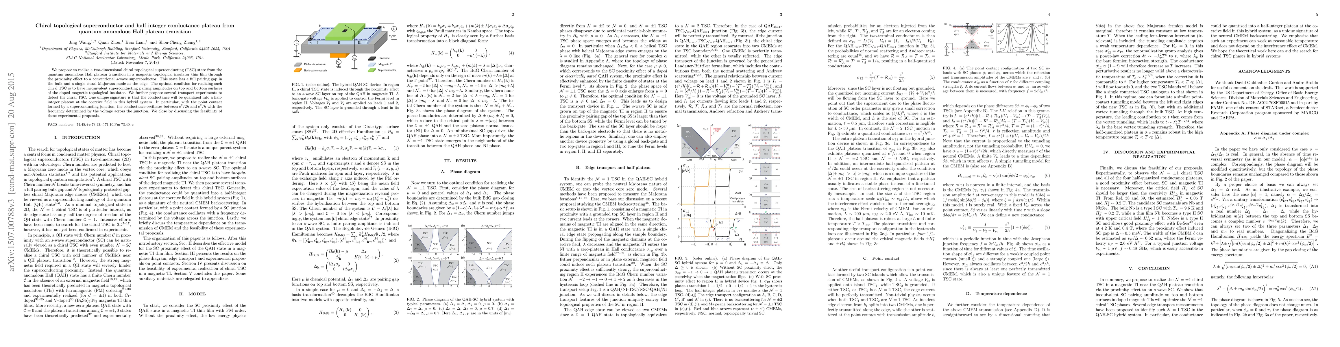 This paper proposes realizing a chiral topological superconducting state from a quantum anomalous Hall plateau transition in a magnetic topological insulator via proximity effect with a conventional $s$-wave superconductor. The unique signature of this state is a half-integer conductance plateau, detectable through transport experiments, particularly with superconducting junctions.