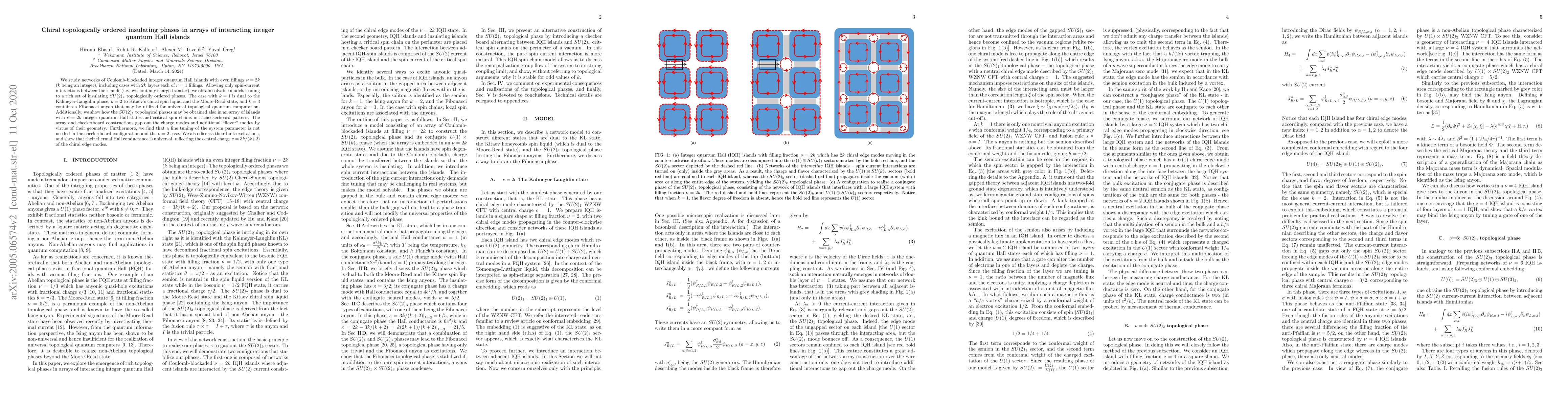 This research explores networks of quantum Hall islands with even fillings, revealing solvable models that produce a variety of topologically ordered SU(2)_k phases. Notable cases include k=1 (dual to Kalmeyer-Laughlin), k=2 (Kitaev's chiral spin liquid and Moore-Read), and k=3 (featuring a Fibonacci anyon for quantum computation). These phases can also emerge in arrays of integer quantum Hall states and critical spin chains. The methodology shows that fine-tuning isn't necessary in certain configurations, and the thermal Hall conductance reflects the central charge of chiral edge modes.