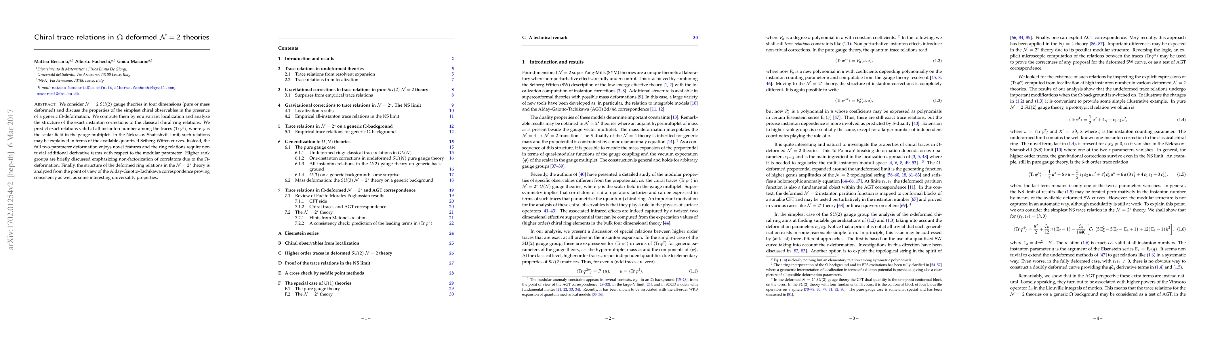 This paper investigates the chiral trace relations in $\Omega$-deformed $\mathcal N=2$ $SU(2)$ gauge theories, employing equivariant localization to compute exact instanton corrections. It predicts novel exact relations among traces of scalar fields, revealing non-trivial derivative terms and non-factorization in higher rank groups.