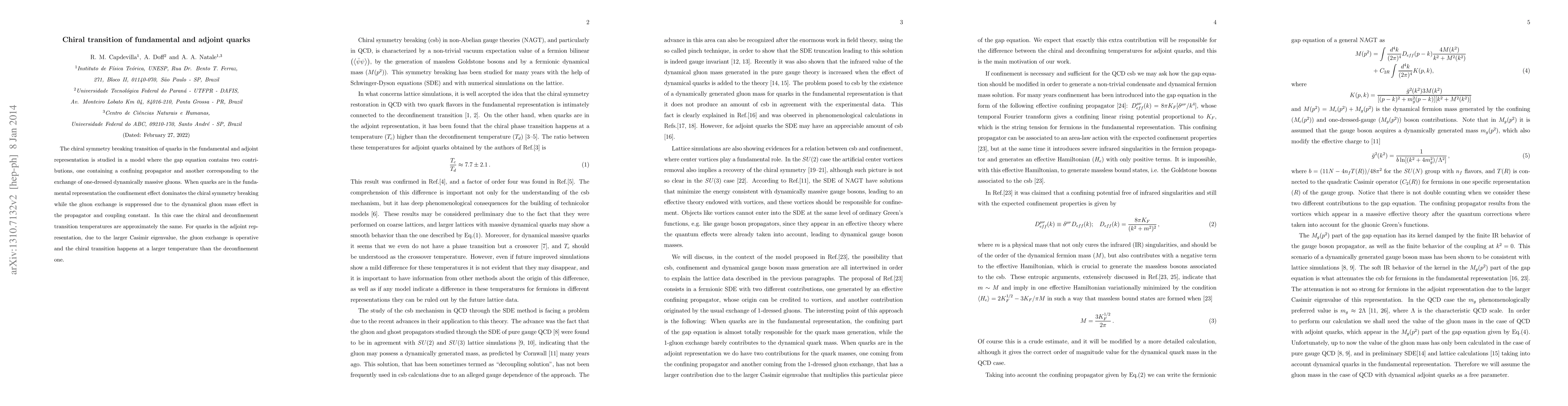This paper investigates the chiral symmetry breaking in quarks of fundamental and adjoint representations, showing that confinement effects dominate for fundamental quarks, aligning chiral and deconfinement transitions, while gluon exchange driven by larger Casimir eigenvalues in adjoint quarks results in a higher chiral transition temperature compared to deconfinement.