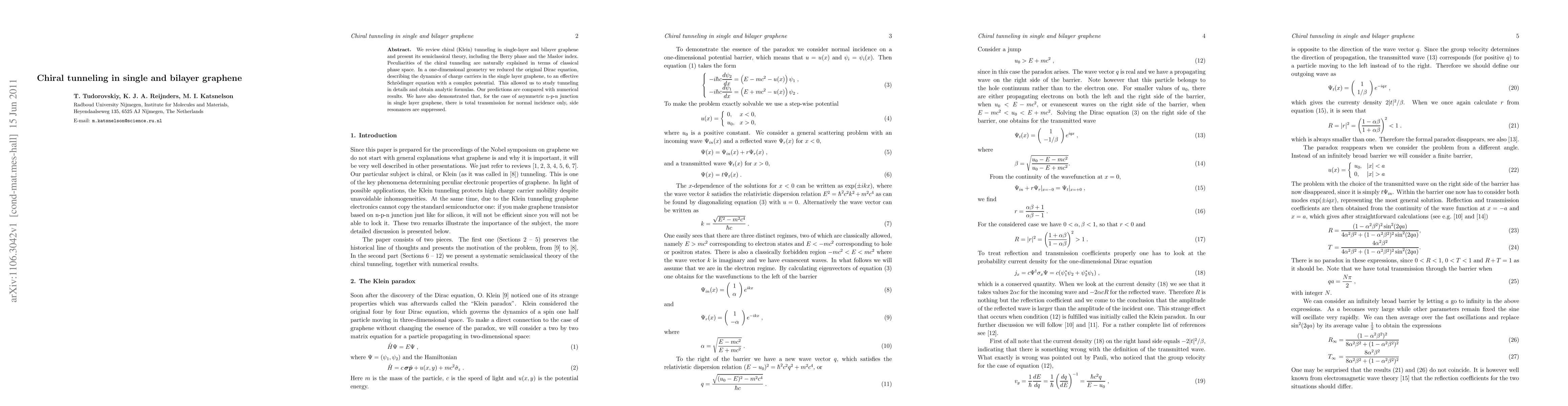 This paper reviews chiral tunneling in single-layer and bilayer graphene, presenting a semiclassical theory that includes the Berry phase and the Maslov index. The authors derive an effective Schrödinger equation to study tunneling and compare their analytic predictions with numerical results, finding total transmission for normal incidence in asymmetric n-p-n junctions.