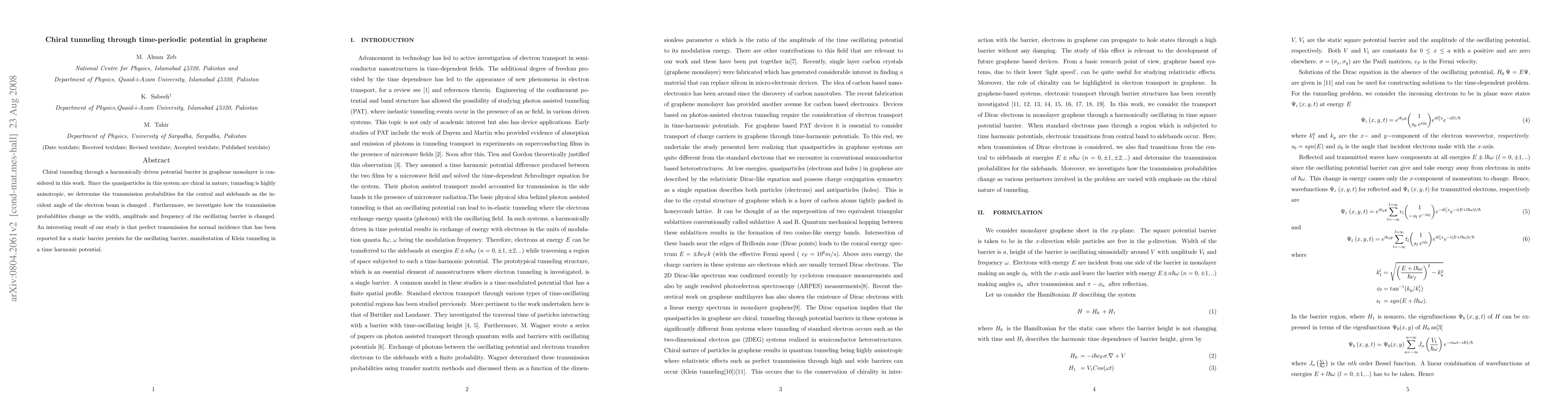 This paper investigates chiral tunneling in graphene under a harmonically driven potential, finding anisotropic tunneling probabilities dependent on electron beam incidence angle. The study reveals that perfect transmission for normal incidence, akin to Klein tunneling, persists even in the presence of an oscillating barrier.