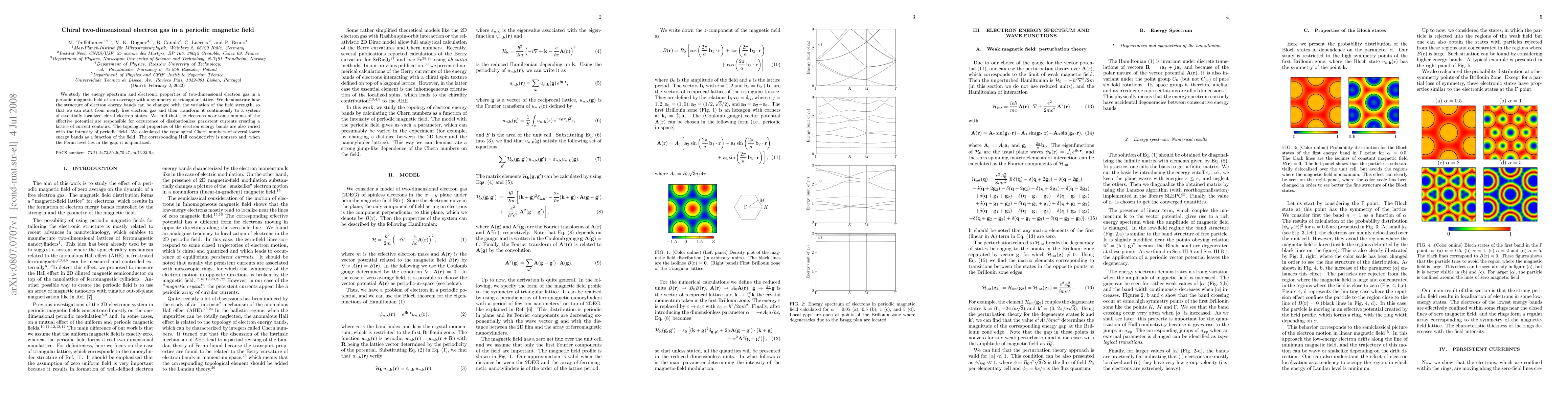 This paper investigates the energy spectrum and electronic properties of a two-dimensional electron gas under a periodic magnetic field with zero average, revealing a transformation from nearly free electrons to localized chiral states. The study finds dissipationless persistent currents and quantizes the Hall conductivity, demonstrating varying topological properties dependent on the field strength.