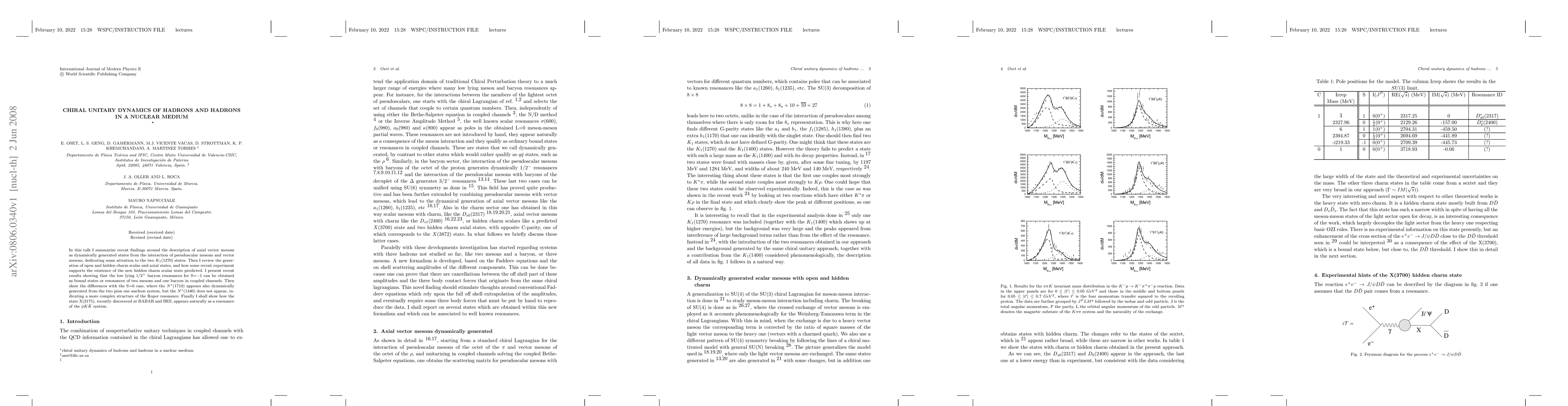 In this talk I summarize recent findings around the description of axial vector mesons as dynamically generated states from the interaction of pseudoscalar mesons and vector mesons, dedicating some attention to the two $K_1(1270)$ states. Then I review the generation of open and hidden charm scalar and axial states, and how some recent experiment supports the existence of the new hidden charm scalar state predicted. I present recent results showing that the low lying $1/2^+$ baryon resonances for S=-1 can be obtained as bound states or resonances of two mesons and one baryon in coupled channels. Then show the differences with the S=0 case, where the $N^*(1710)$ appears also dynamically generated from the two pion one nucleon system, but the $N^*(1440)$ does not appear, indicating a more complex structure of the Roper resonance. Finally I shall show how the state X(2175), recently discovered at BABAR and BES, appears naturally as a resonance of the $\phi K \bar{K}$ system.