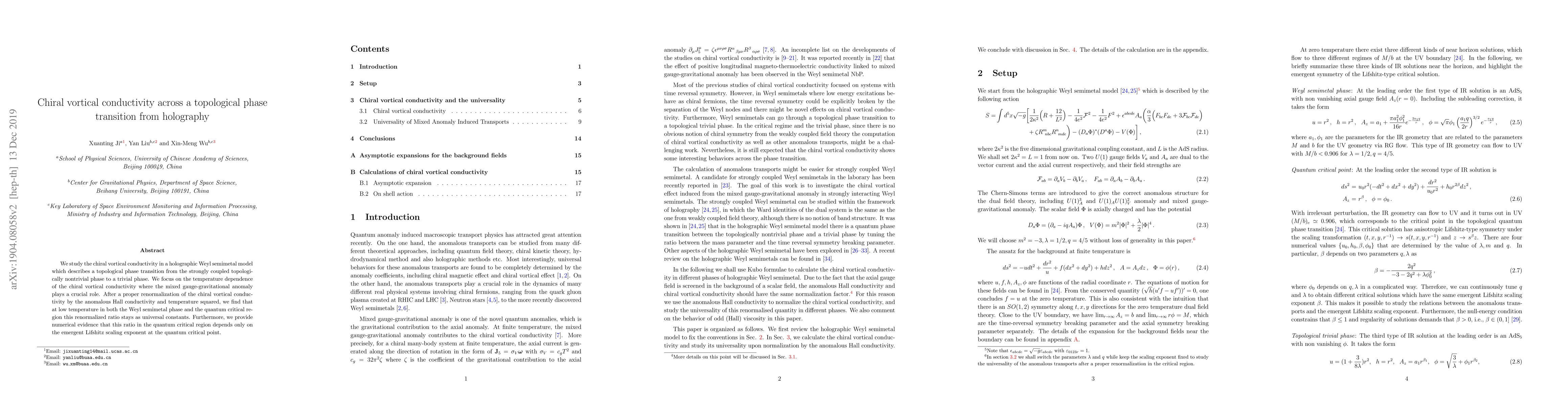 This paper investigates chiral vortical conductivity in a holographic Weyl semimetal model undergoing a topological phase transition. It finds that the renormalized ratio of chiral vortical conductivity to anomalous Hall conductivity and temperature squared remains a universal constant at low temperatures, with its value in the quantum critical region solely dependent on the Lifshitz scaling exponent.