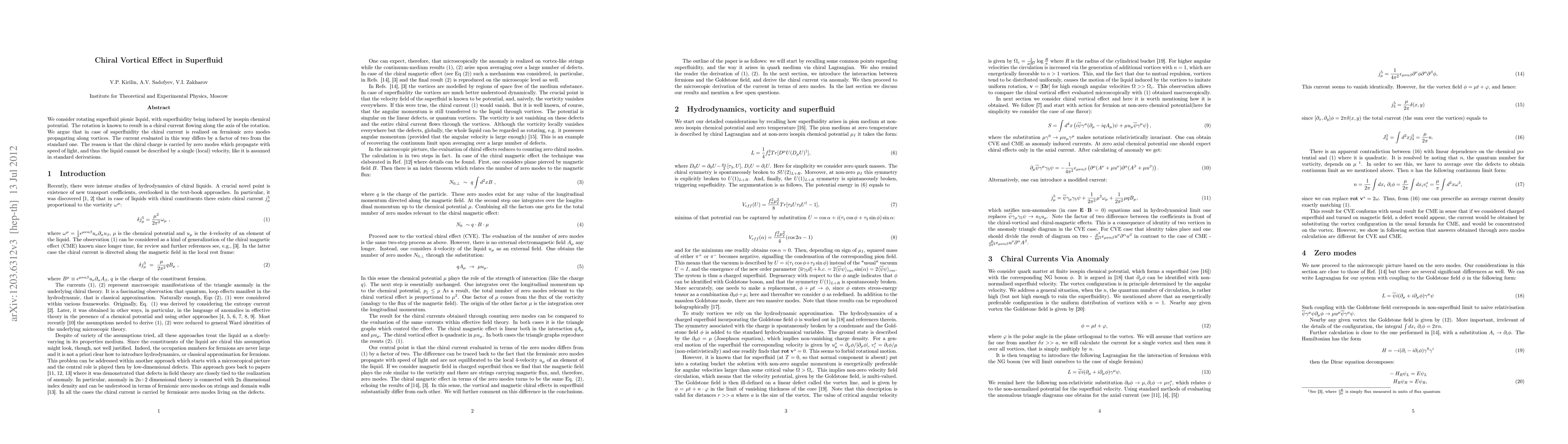 We consider rotating superfluid pionic liquid, with superfluidity being induced by isospin chemical potential. The rotation is known to result in a chiral current flowing along the axis of the rotation. We argue that in case of superfluidity the chiral current is realized on fermionic zero modes propagating along vortices. The current evaluated in this way differs by a factor of two from the standard one. The reason is that the chiral charge is carried by zero modes which propagate with speed of light, and thus the liquid cannot be described by a single (local) velocity, like it is assumed in standard derivations.