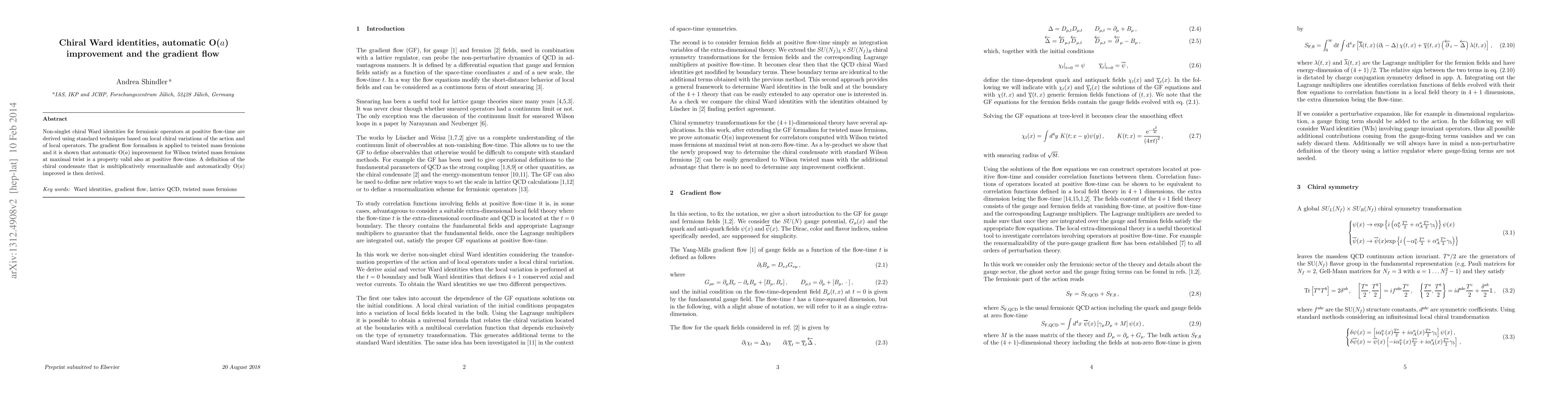This paper derives non-singlet chiral Ward identities using local chiral variations and applies the gradient flow formalism to twisted mass fermions, demonstrating automatic O(a) improvement for Wilson twisted mass fermions at maximal twist. It also introduces a multiplicatively renormalizable and automatically O(a) improved definition of the chiral condensate.