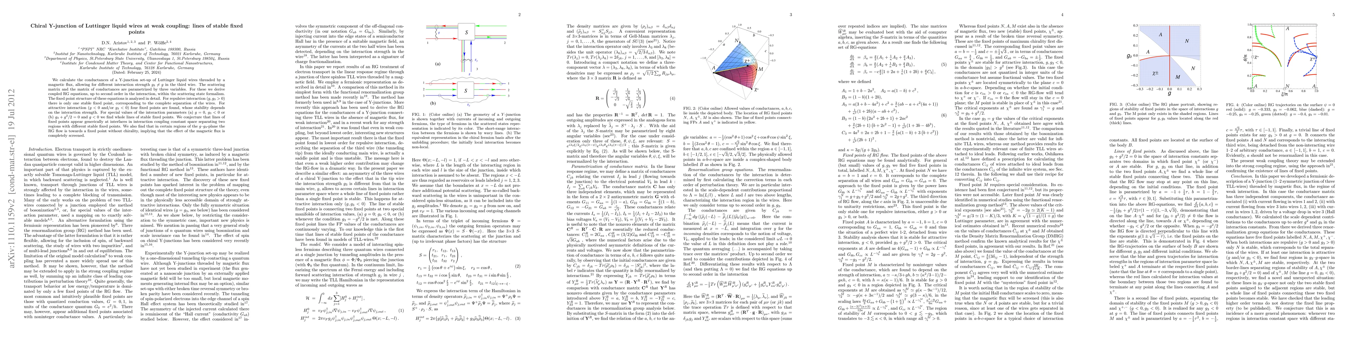 This paper investigates the transport properties of three Luttinger liquid wires connected via a Y-junction, deriving coupled RG equations to analyze their fixed point structure. The study reveals stable fixed points depending on interaction strengths, with lines of stable fixed points for specific interaction conditions and regions where magnetic flux effects are screened.