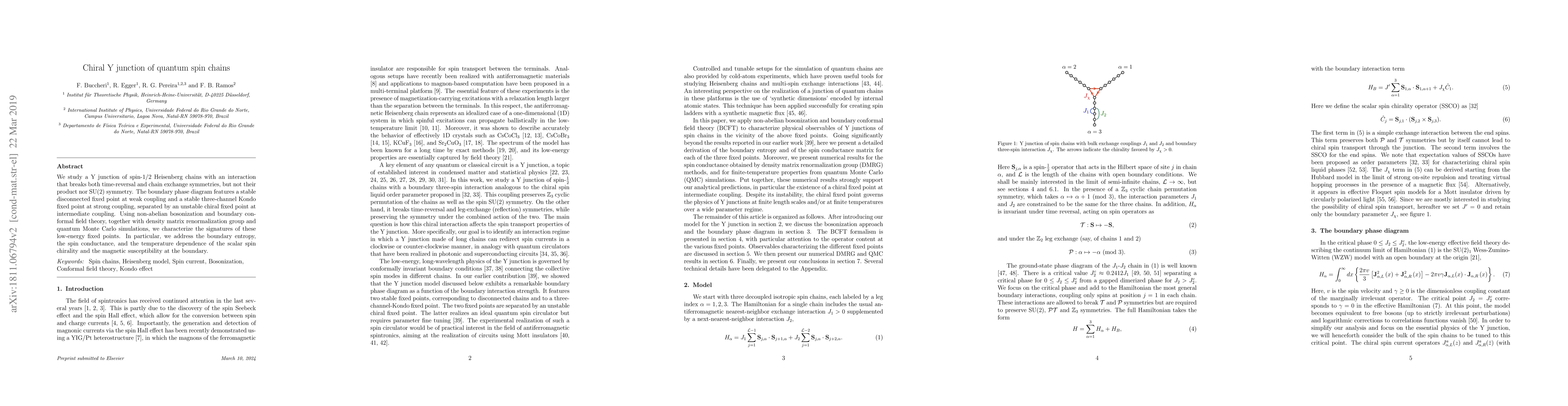 We study a Y junction of spin-1/2 Heisenberg chains with an interaction that breaks both time-reversal and chain exchange symmetries, but not their product nor SU(2) symmetry. The boundary phase diagram features a stable disconnected fixed point at weak coupling and a stable three-channel Kondo fixed point at strong coupling, separated by an unstable chiral fixed point at intermediate coupling. Using non-abelian bosonization and boundary conformal field theory, together with density matrix renormalization group and quantum Monte Carlo simulations, we characterize the signatures of these low-energy fixed points. In particular, we address the boundary entropy, the spin conductance and the temperature dependence of the scalar spin chirality and the magnetic susceptibility at the boundary.