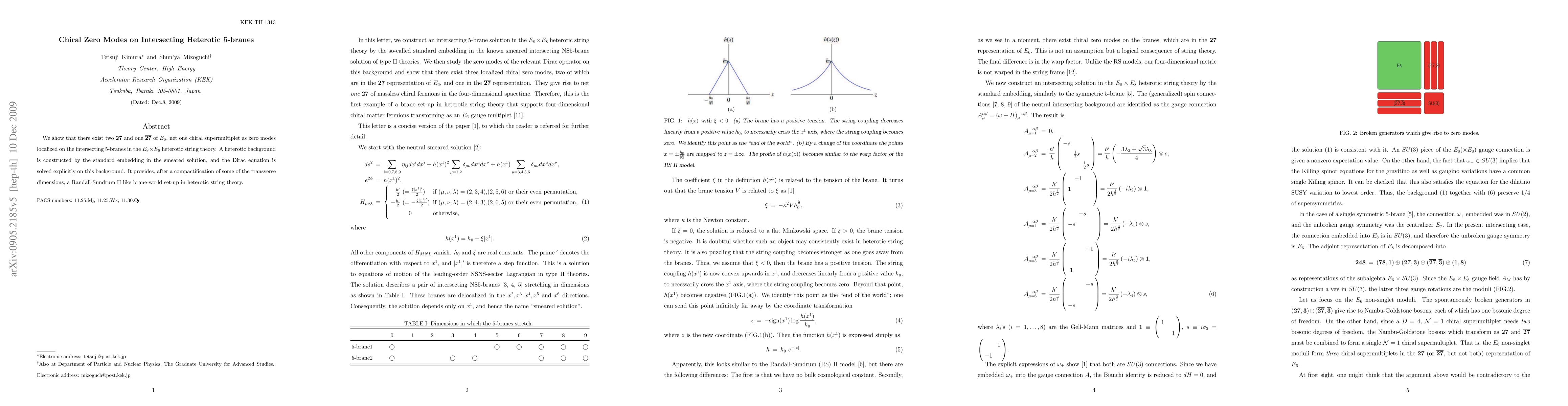 This paper demonstrates the existence of chiral zero modes on intersecting heterotic 5-branes in E8 x E8 heterotic string theory, revealing a net one chiral supermultiplet from two 27 and one 27bar of E6. A heterotic background is constructed, and the Dirac equation is solved to provide a Randall-Sundrum II-like brane-world setup after compactification.