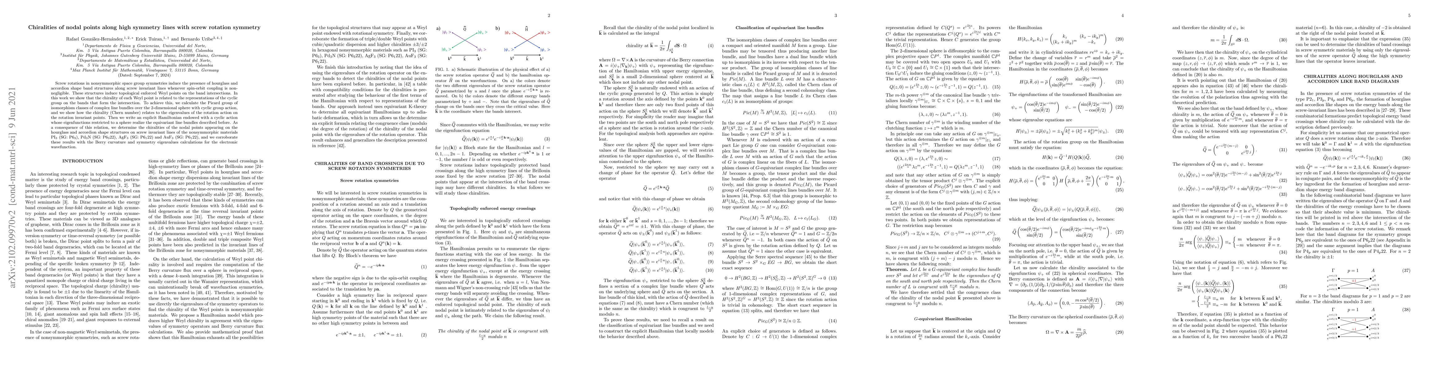 Screw rotations in nonsymmorphic space group symmetries induce the presence of hourglass and accordion shape band structures along screw invariant lines whenever spin-orbit coupling is nonnegligible. These structures induce topological enforced Weyl points on the band intersections. In this work we show that the chirality of each Weyl point is related to the representations of the cyclic group on the bands that form the intersection. To achieve this, we calculate the Picard group of isomorphism classes of complex line bundles over the 2-dimensional sphere with cyclic group action, and we show how the chirality (Chern number) relates to the eigenvalues of the rotation action on the rotation invariant points. Then we write an explicit Hamiltonian endowed with a cyclic action whose eigenfunctions restricted to a sphere realize the equivariant line bundles described before. As a consequence of this relation, we determine the chiralities of the nodal points appearing on the hourglass and accordion shape structures on screw invariant lines of the nonsymmorphic materials PI3 (SG: P63), Pd3N (SG: P6322), AgF3 (SG: P6122) and AuF3 (SG: P6122), and we corroborate these results with the Berry curvature and symmetry eigenvalues calculations for the electronic wavefunction.