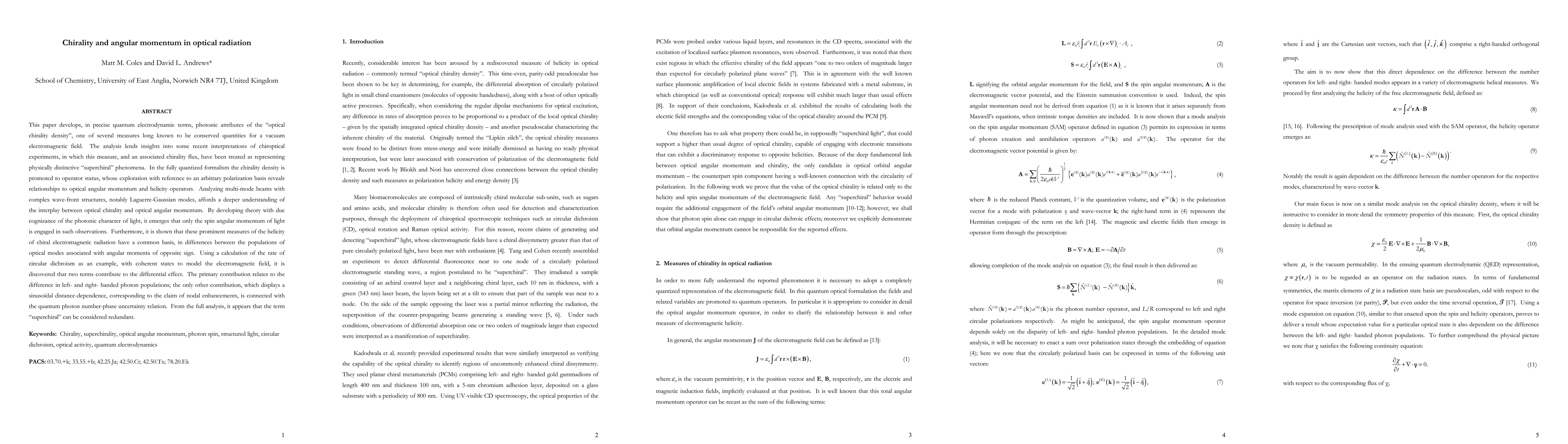 This paper develops, in precise quantum electrodynamic terms, photonic attributes of the "optical chirality density", one of several measures long known to be conserved quantities for a vacuum electromagnetic field. The analysis lends insights into some recent interpretations of chiroptical experiments, in which this measure, and an associated chirality flux, have been treated as representing physically distinctive "superchiral" phenomena. In the fully quantized formalism the chirality density is promoted to operator status, whose exploration with reference to an arbitrary polarization basis reveals relationships to optical angular momentum and helicity operators. Analyzing multi-mode beams with complex wave-front structures, notably Laguerre-Gaussian modes, affords a deeper understanding of the interplay between optical chirality and optical angular momentum. By developing theory with due cognizance of the photonic character of light, it emerges that only the spin angular momentum of light is engaged in such observations. Furthermore, it is shown that these prominent measures of the helicity of chiral electromagnetic radiation have a common basis, in differences between the populations of optical modes associated with angular momenta of opposite sign. Using a calculation of the rate of circular dichroism as an example, with coherent states to model the electromagnetic field, it is discovered that two terms contribute to the differential effect. The primary contribution relates to the difference in left- and right- handed photon populations; the only other contribution, which displays a sinusoidal distance-dependence, corresponding to the claim of nodal enhancements, is connected with the quantum photon number-phase uncertainty relation. From the full analysis, it appears that the term "superchiral" can be considered redundant.