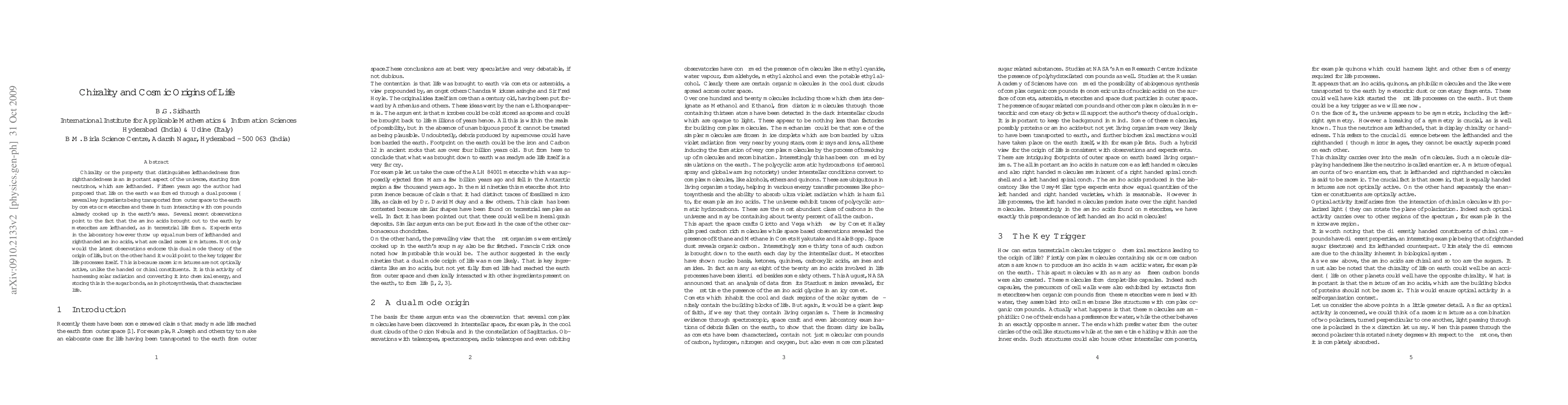 Chirality or the property that distinguishes lefthandedness from righthandedness is an important aspect of the universe, starting from neutrinos, which are lefthanded. Fifteen years ago the author had proposed that life on the earth was formed through a dual process -- several key ingredients being transported from outer space to the earth by comets or meteorites and these in turn interacting with compounds already cooked up in the earth's seas. Several recent observations point to the fact that the amino acids brought out to the earth by meteorites are lefthanded, as in terrestrial life forms. Experiments in the laboratory however throw up equal numbers of lefthanded and righthanded amino acids, what are called racemic mixtures. Not only would the latest observations endorse this dual mode theory of the origin of life, but on the other hand it would point to the key trigger for life processes itself. This is because racemic mixtures are not optically active, unlike the handed or chiral constituents. It is this activity of harnessing solar radiation and converting it into chemical energy, and storing this in the sugar bonds, as in photosynthesis, that characterizes life.