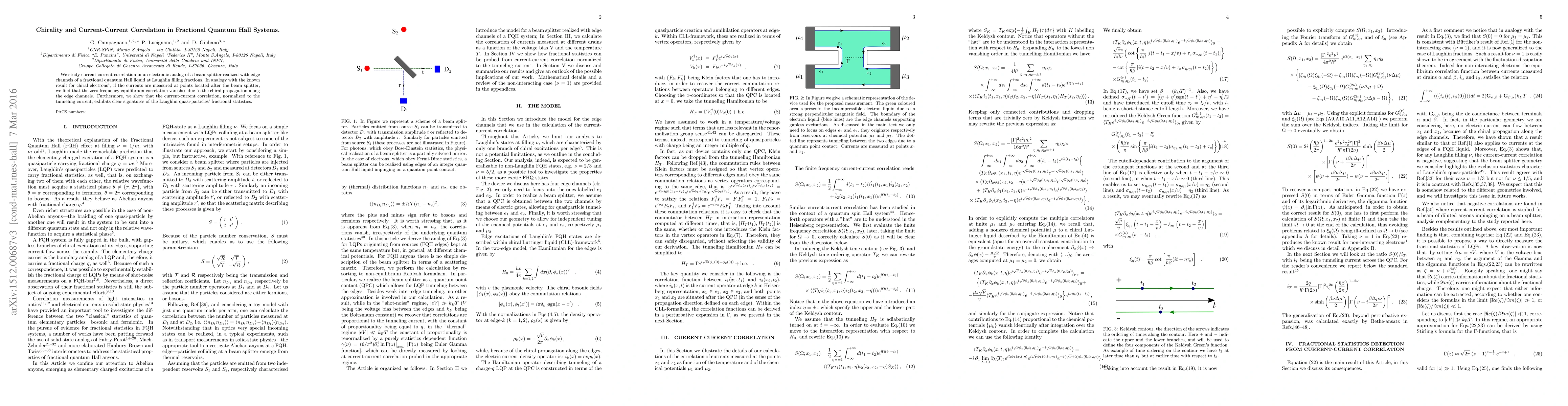 Summary: The research investigates current-current correlations in fractional quantum Hall systems, finding that zero frequency equilibrium correlation vanishes due to chiral propagation. It also reveals signatures of Laughlin quasi-particles' fractional statistics in the normalized current-current correlation.