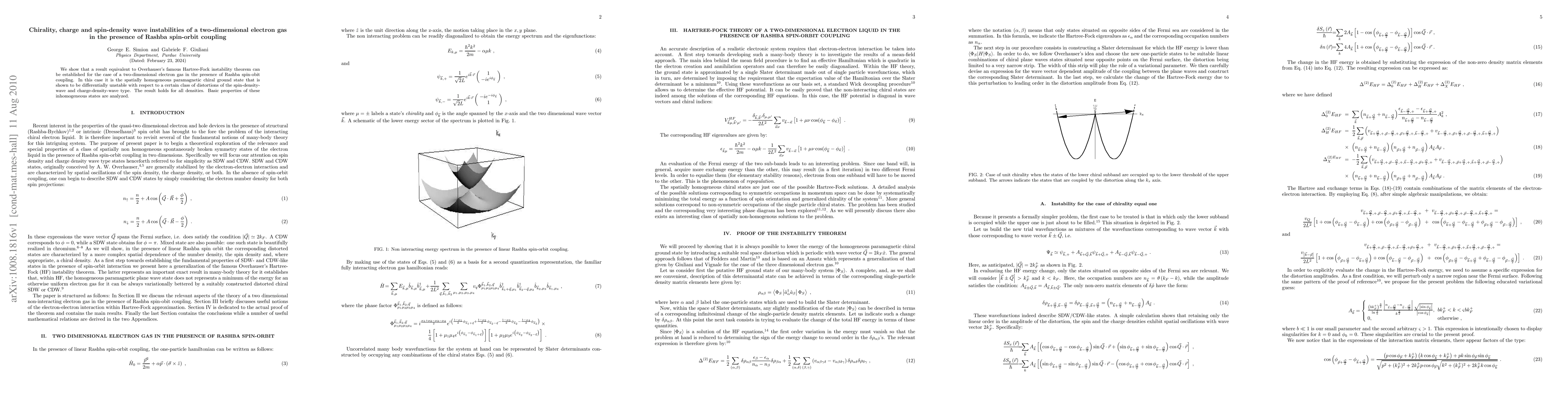 This paper establishes a Hartree-Fock instability theorem for a two-dimensional electron gas with Rashba spin-orbit coupling, showing that the paramagnetic chiral ground state is unstable to spin-density-wave and charge-density-wave distortions, regardless of electron density. The study analyzes fundamental characteristics of these resulting inhomogeneous states.