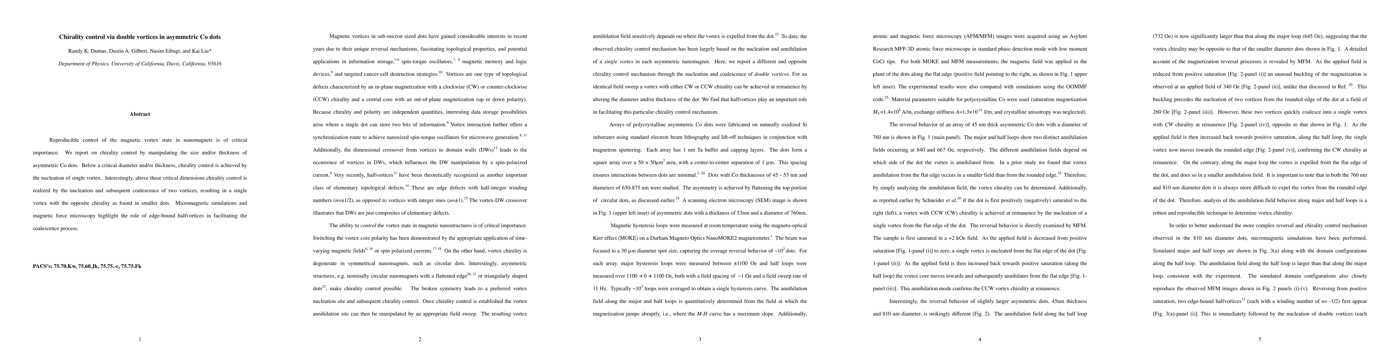 This paper demonstrates chirality control in asymmetric Co dots by manipulating their size and thickness, achieving single vortex nucleation below critical dimensions and dual vortex coalescence above them. Micromagnetic simulations and magnetic force microscopy reveal the role of edge-bound halfvortices in the coalescence process.