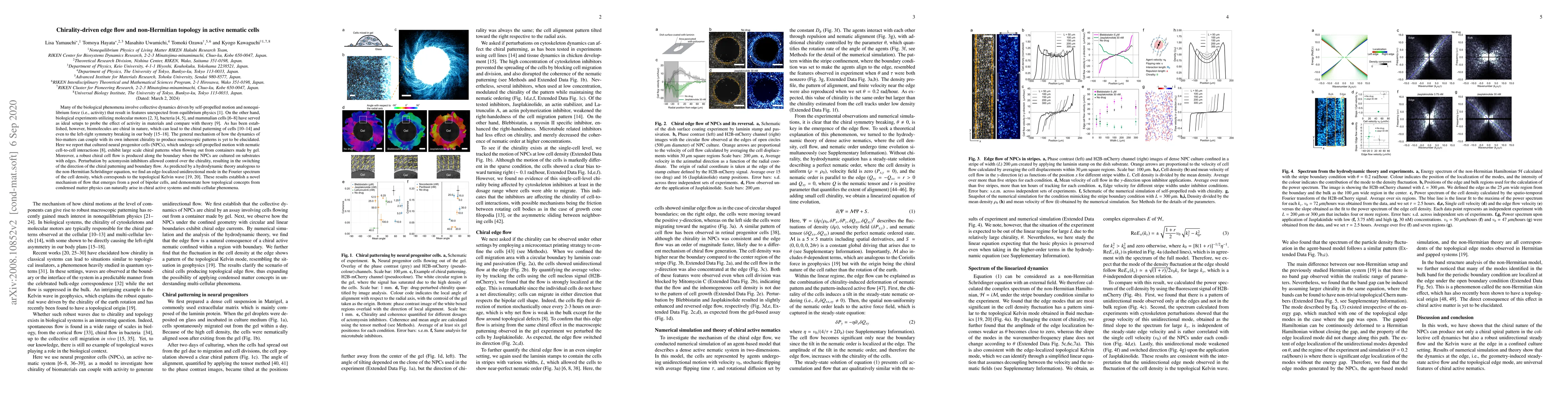 This paper investigates how chirality in self-propelled cells leads to large-scale chiral patterns and edge-localized unidirectional flow in active nematic systems. The study demonstrates that cultured neural progenitor cells exhibit robust chiral cell flow along substrate edges, which can be controlled by actomysin inhibitors, and aligns with a non-Hermitian topological model.