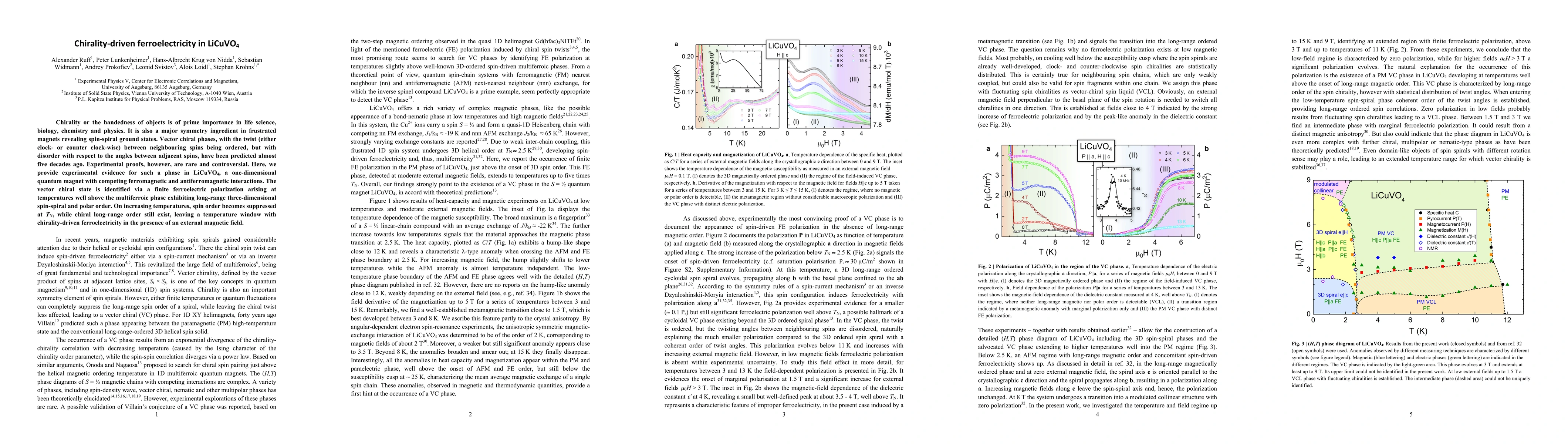 Chirality or the handedness of objects is of prime importance in life science, biology, chemistry and physics. It is also a major symmetry ingredient in frustrated magnets revealing spin-spiral ground states. Vector chiral phases, with the twist (either clock- or counter clock-wise) between neighbouring spins being ordered, but with disorder with respect to the angles between adjacent spins, have been predicted almost five decades ago. Experimental proofs, however, are rare and controversial. Here, we provide experimental evidence for such a phase in LiCuVO$_4$, a one-dimensional quantum magnet with competing ferromagnetic and antiferromagnetic interactions. The vector chiral state is identified via a finite ferroelectric polarization arising at temperatures well above the multiferroic phase exhibiting long-range three-dimensional spin-spiral and polar order. On increasing temperatures, spin order becomes suppressed at TN, while chiral long-range order still exist, leaving a temperature window with chirality-driven ferroelectricity in the presence of an external magnetic field.